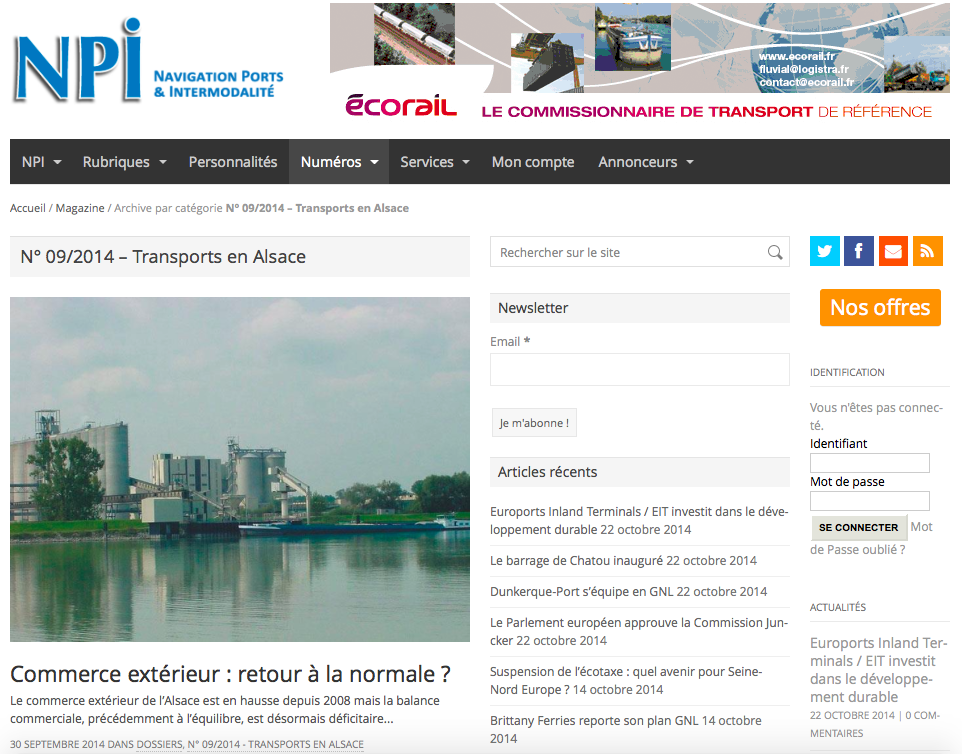 La revue mensuelle NPI – Navigation, Ports & Intermodalité propose sur son site Internet un large dossier consacré aux transports en Alsace. La revue spécialisée balaye une multitude de sujets : du transport routier au transport aérien en passant par le réseau SNCF. En 2011, les secteurs du commerce et du transport représentaient près de 61 % des entreprises alsaciennes selon l’Insee.