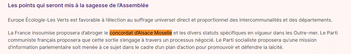 Dans une vidéo au lendemain du 1er tour, Alain Fontanel, distancé dans la circonscription 1 à Strasbourg par Sandra Regol (EE-LV), rappelle qu’il défend « la laïcité », mais en même temps les dispositions qui contournent la loi de 1905, à savoir le « Concordat, le droit local, que Jean-Luc Mélenchon souhaite remettre en cause ». Plus vague dans un communiqué, Bruno Studer indique que son projet diffère de celui de son concurrent Sébastien Mas (LFI) sur « la défense des spécificités alsaciennes ». Sylvain Waserman (Modem) organise une marche reliant quatre lieux de cultes de la Meinau pour s’opposer à la « vision destructrice de la France insoumise » contre le Concordat…