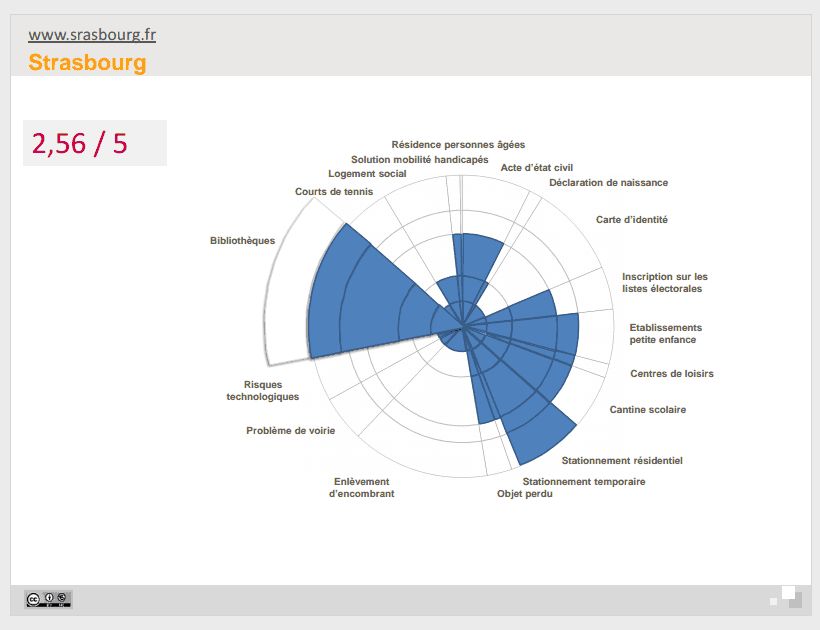 Strasbourg arrive deuxième du classement des 25 plus grandes villes de France, avec une moyenne de 2,56, derrière Le Havre (2,72) mais devant Paris (2,42). La note moyenne est 1,77. Pas brillant. A noter que la relative bonne note de Strasbourg doit beaucoup aux services en ligne disponibles pour les médiathèques. L’obtention d’une carte de stationnement résidentiel est aussi une procédure entièrement fonctionnelle :