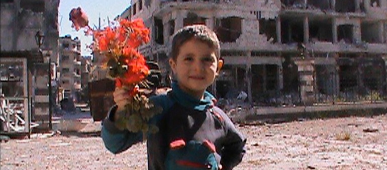 On est à Homs en Syrie durant l’été 2013, un enfant de 4 ou 5 ans dépose des coquelicots sur la tombe de son père, tué dans les combats visant à écraser la révolte contre la dictature de Bachar al-Assad. Puis il passe à une autre tombe, indique à la caméra que « celui là n’est pas enterré très profond ». Tout autour de lui, un champ de ruines et d’immeubles en gravas. La caméra continue de le suivre, il recommande d’éviter une rue car « un sniper s’y est installé ».