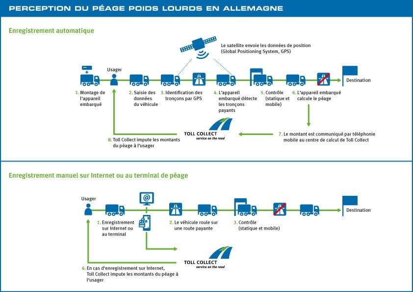 Comme pour le projet d’écotaxe en France, c’est une société semi-privée (dont le français Cofiroute détient 10%), Toll-Collect, qui est chargée de maintenir les installations de mesure et de collecter les péages. Les transporteurs s’acquittent d’un abonnement payé à l’avance ou au passage. Le contrôle des camions est effectué au moyen d’un dispositif d’identification installé dans les véhicules, appelé On-Board Unit (OBU) et que les quelque 300 portiques disséminés sur tout le territoire détectent automatiquement. Toll-Collect est rémunéré 600 millions d’euros chaque année pour la maintenance du système et la perception de la taxe.