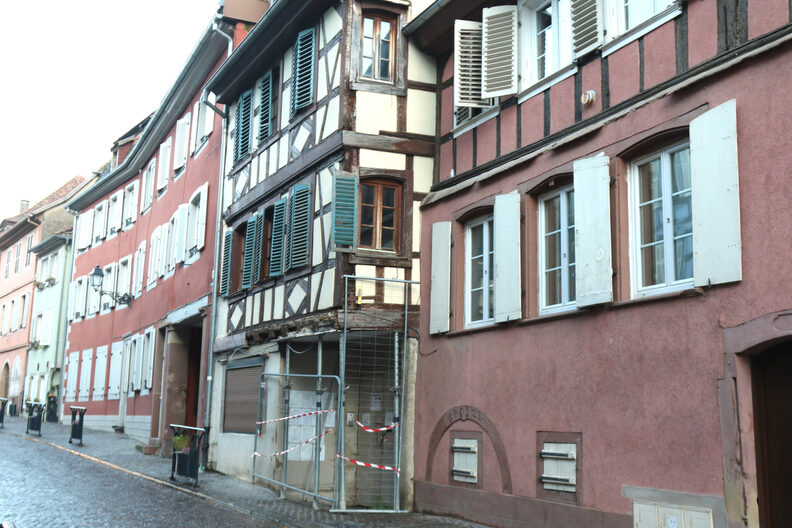Dans une rue pavée et parsemée de bacs à fleurs, des maisons anciennes forment un décor propret. La partie historique de Barr, petite ville de la route des vins, c’est un peu l’image d’Épinal de l’Alsace. Soudain, un immeuble dénote malgré ses colombages traditionnels. « Zone dangereuse, stop, accès interdit », peut-on lire sur la porte d’entrée cadenassée. Une barrière bloque le passage, et des étais métalliques maintiennent une partie du premier étage.
