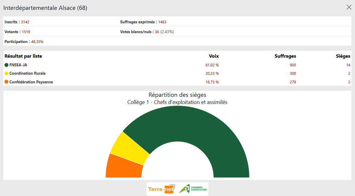 Dans le Bas-Rhin, la liste FNSEA-JA obtient 15 sièges sur 18. La Coordination rurale aura 2 sièges, et la Confédération paysanne n’en aura qu’un seul. Dans le Bas-Rhin, 14 membres de la liste FNSEA-JA pourront siéger, contre 2 pour la Confédération paysanne et 2 pour la Coordination rurale. Ils pourront par exemple donner leur avis dans des commissions sur des démarches foncières ou sur des contrôles d’exploitations, notamment en cas d’agrandissement.