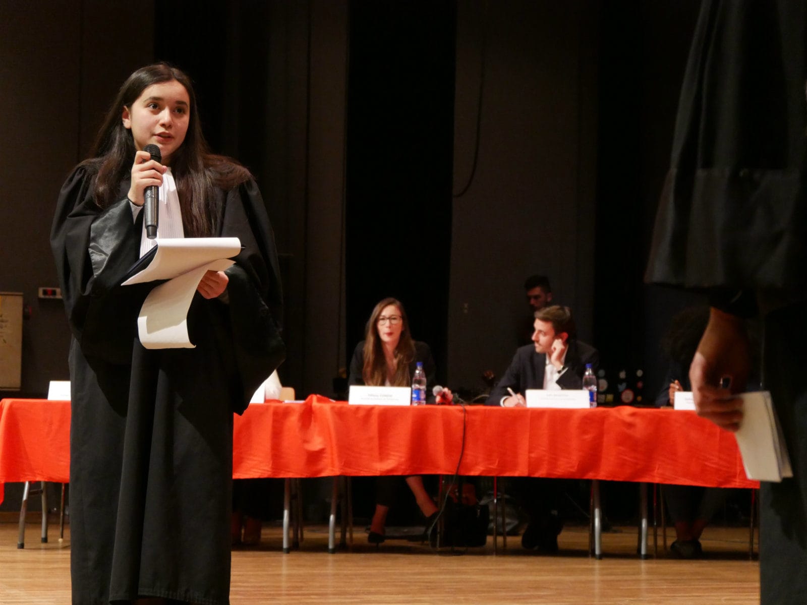 Nike blanches sous une robe d’avocat. Élise tient le micro d’une main et ses notes de l’autre. Jeudi 12 avril, vers 20h, le rideau rouge vient de s’ouvrir sur l’estrade de la salle Marcel Marceau, au Neudorf à Strasbourg. Pour la finale du concours d’éloquence Ogma, l’association D-Clic a le sens de la mise en scène. La collégienne de Hautepierre, Élise, est à gauche, proche des six membres du jury. Elle fait face à Chaima, une élève du collège Leclerc de Schiltigheim.