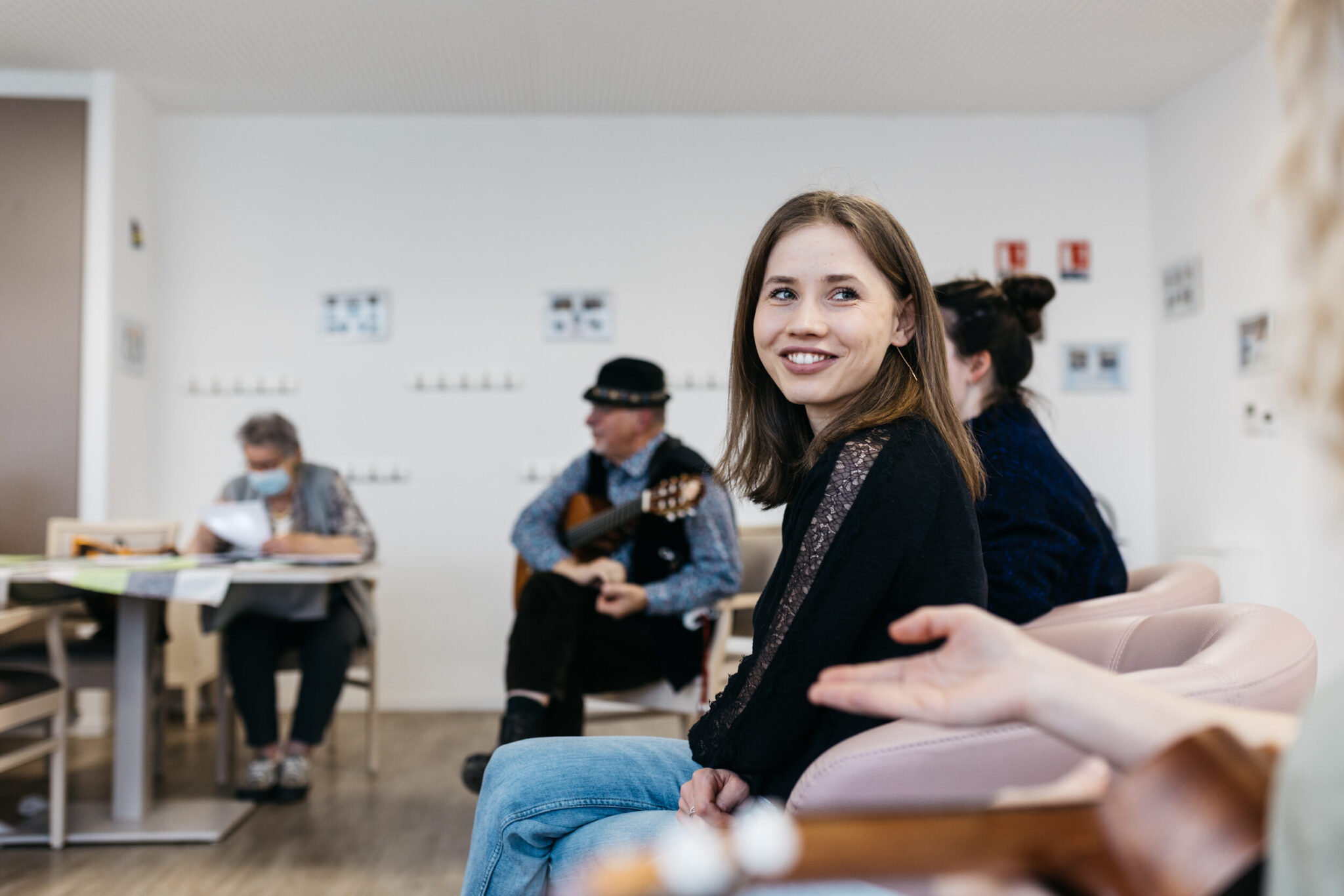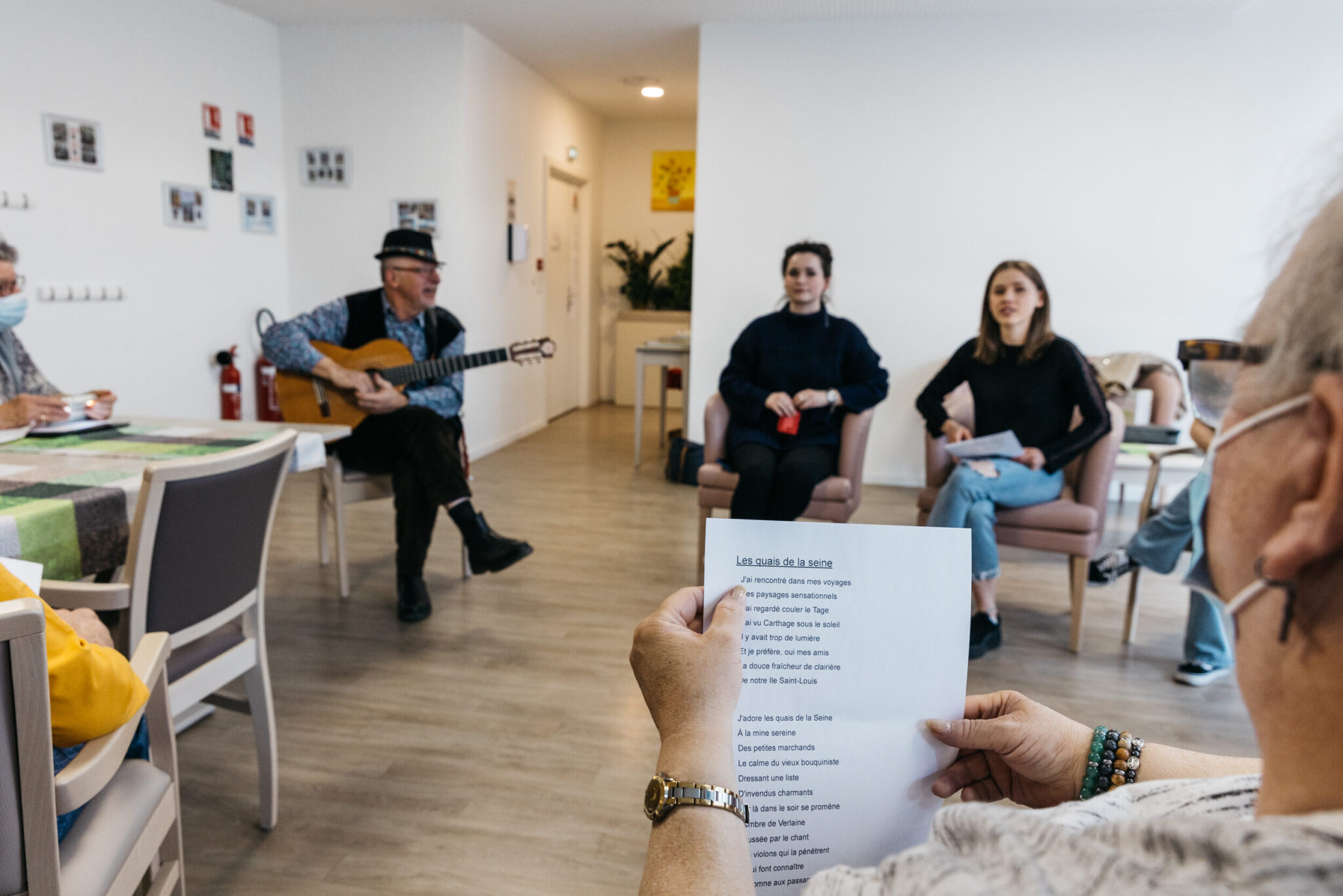 Aujourd’hui Marina a décidé de faire apprendre Les quais de la Seine de Lucienne Delyle. Les violons et la voix de gouaille aux R roulés s’élèvent du smartphone, les jeunes filles battent la mesure de ce morceau composé en 1947. « Elle est jolie la mélodie », lance Christiane. Aucune des pensionnaires ne connaissait cette chanson de l’interprète du tube planétaire mon Amant de Saint-Jean. Elles l’apprendront au cours des prochaines semaines. Georgette a aussi fait partie dune chorale à Marlenheim, elle dit goûter à cet atelier. Assise juste à côté de Jean-Claude le guitariste, elle échange des blagues avec lui.