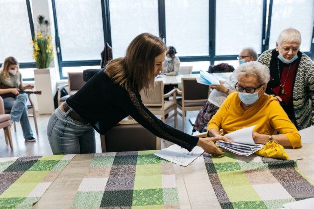 On passe à Mon amant de Saint Jean, puis La vie en rose. Marina et Yuliia, se lèvent pour aider à trouver les paroles parmi les polycopiés. Liliane, 88 ans, n’en a pas besoin, elle connaît couplets et le refrain par cœur. Elle aime les chansons d’amour mais n’aurait rien contre des marches militaires, elle en a souvent écouté avec son défunt époux, militaire de carrière.