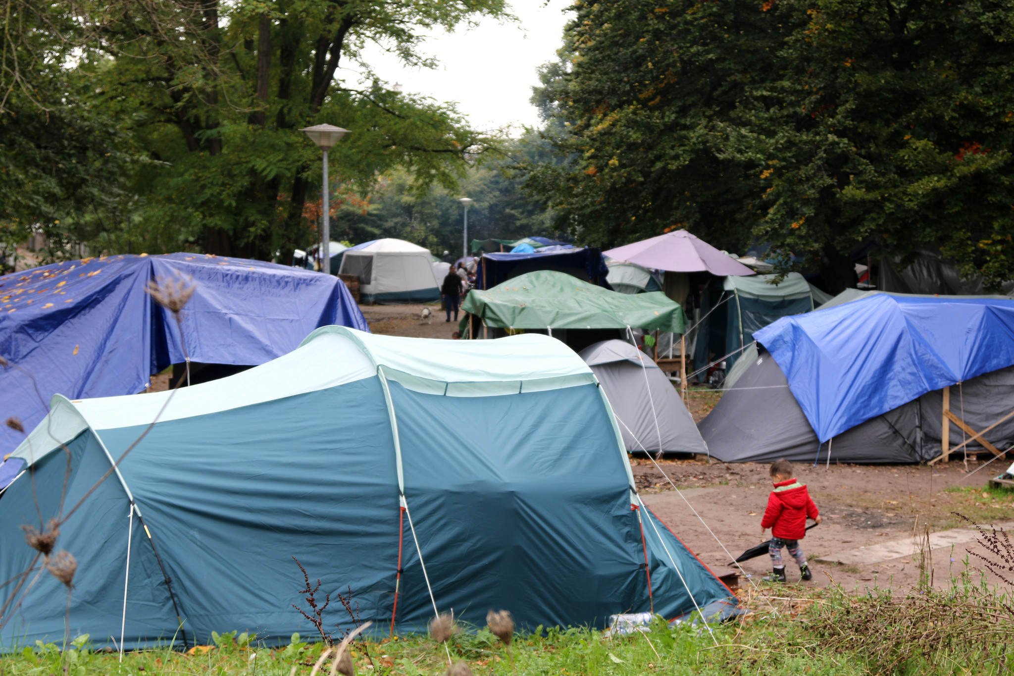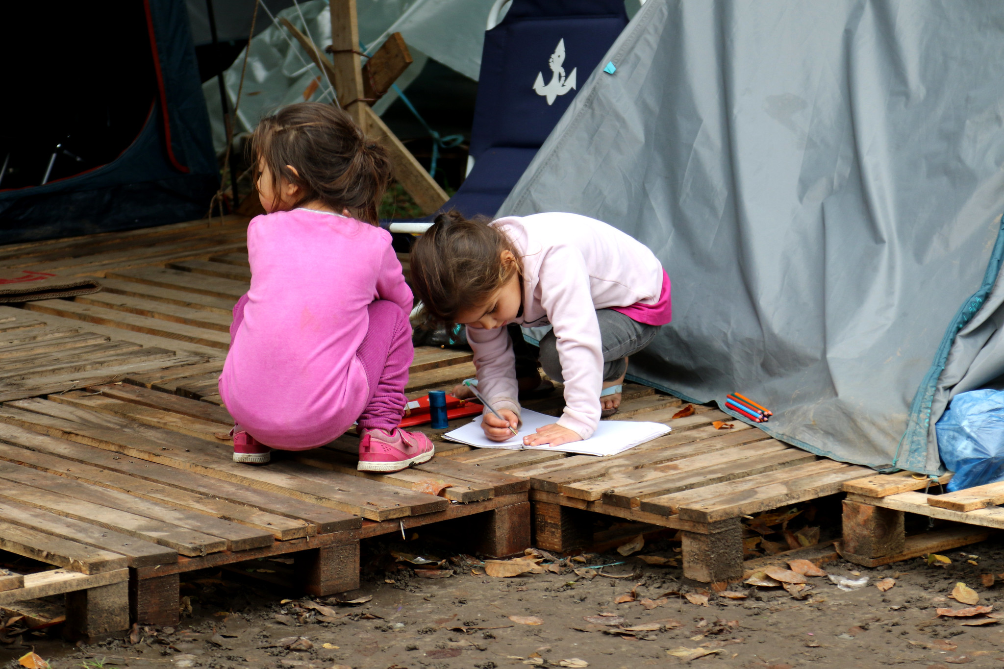 Six petites filles sont accroupies au pied d’une tente, sur des palettes en bois. Certaines se penchent sur des feuilles pour écrire ou dessiner. La même scène a lieu sur plusieurs points du camp de Krimmeri, qui grouille d’enfants ce mercredi 16 octobre, jour de repos scolaire. D’autres préfèrent jouer, seuls ou à plusieurs. Un garçon qui ne doit pas avoir plus de cinq ans marche sur le chemin boueux, en trainant un parapluie.