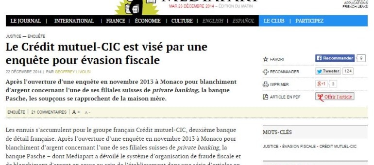 Le site d’informations Mediapart indique que la Direction nationale des enquêtes fiscales (DNEF) mène une enquête contre le Crédit Mutuel-CIC. La banque alsacienne est suspecteé par les services de Bercy d’avoir organisé un système d’évasion fiscale via sa filiale suisse, la banque Pasche.