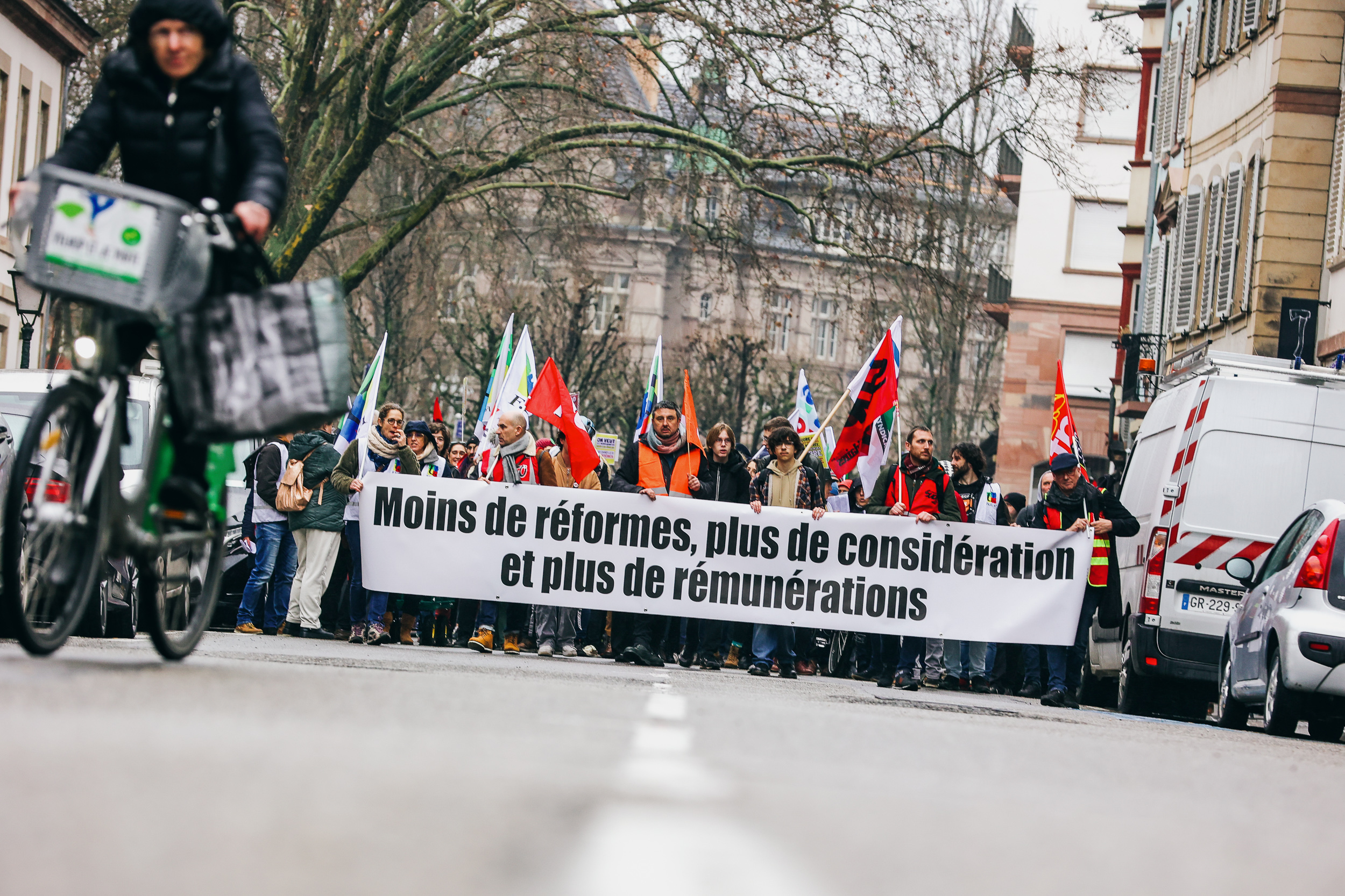 « Les plus anciens sont devant, en train de chanter. » Avec un sourire, Marie-Laure Friot, conseillère syndicale FSU 67, désigne du regard ses collègues enseignants. Armés de gilets blancs et de carnets de chansons très fournis, ils entonnent des vers invitant Emmanuel Macron et Amélie Oudéa-Castera, ministre de l’Éducation nationale, à prendre leurs retraites alors que le cortège, débuté place Kléber en début d’après-midi du jeudi 1er février, dépasse la cathédrale.