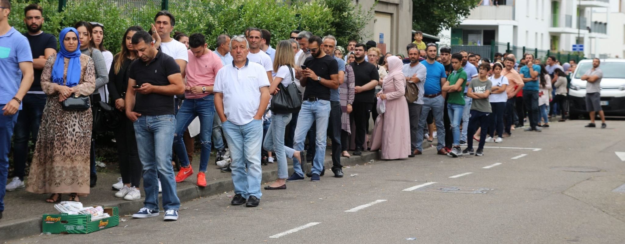 Salim et sa famille sont venus de Belfort. Ils ont attendu trois heures pour pouvoir mettre leurs bulletins dans l’urne. Ils retournent à leurs voitures les bras chargés de sacs de fruits et légumes glanés à la kermesse de la mosquée de Ditib, qui fête la fin du Ramadan. Le père s’amuse des accusations de corruption des électeurs :