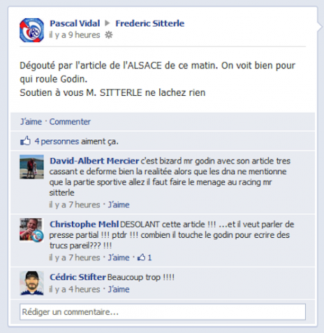 Entre ses « posts » se greffent des mots d’encouragements de supporters : « J’ai confiance en votre projet, courage M. Sitterlé ! », « le monde populaire qui aime le Racing est avec vous, allez au bout des choses, nous vous porteront sur nos épaules… », « La meilleure défense, c’est l’attaque… Pas le choix président ! » Etc.