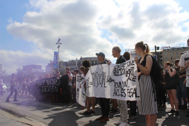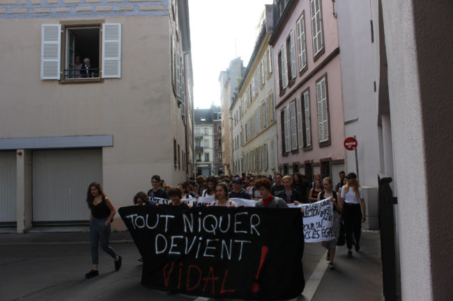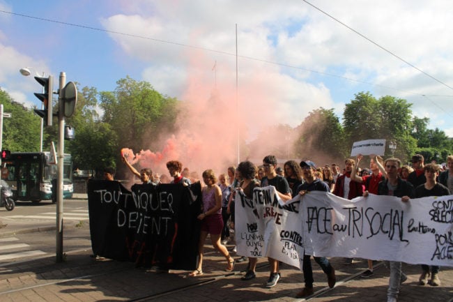 Les manifestants ont scandé les slogans habituels contre la réforme de l’orientation et la plateforme Parcoursup (« fac ouverte à tous les bacheliers » ; « trions les déchets, pas les bacheliers », « Et Parcoursup, c’est dégueulasse » etc.), ainsi que « Mc Do paie tes impôts » en passant devant l’un des restaurants américains ou encore « solidarité avec les cheminots » devant la gare, elle aussi bien gardée.