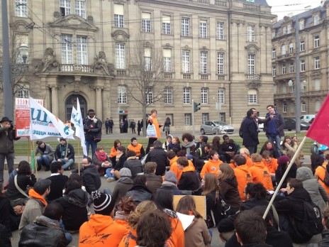 Le cortège des manifestants, après s’être rassemblé sur le parvis de la fac de droit, avance ensuite boulevard de la Victoire. Avec en ligne de mire, le Crous en face de la station Gallia, puis la préfecture. Quelques professeurs sont présents, mais le président de l’UdS, qui vient de publier une lettre de soutien aux étudiants étrangers, n’est pas dans le cortège. A l’approche du Crous, les slogans se font plus agressifs : « A ceux qui veulent virer les étrangers, les jeunes répondent résistance ! C’est Claude Guéant qu’il faut virer ! » Et le traditionnel : « Nous sommes tous des enfants d’immigrés à la première, à la deuxième, à la troisième génération ! »