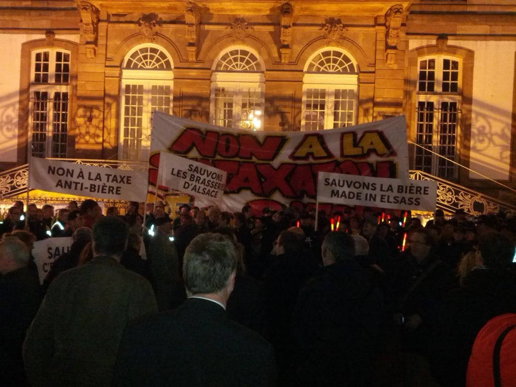 Environ 300 personnes, en majorité des employés de l’industrie brassicole alsacienne, étaient présentes lundi soir vers 18h devant l’hôtel de ville de Strasbourg, pour protester contre la hausse des taxes sur la bière. Les brasseurs alsaciens présentaient à Roland Ries, maire de Strasbourg, la nouvelle bière de Noël. Ils ont saisi l’occasion pour que Roland Ries, qui est aussi sénateur, porte leur combat demain mardi devant l’assemblée, où sera examiné le projet de loi du gouvernement.