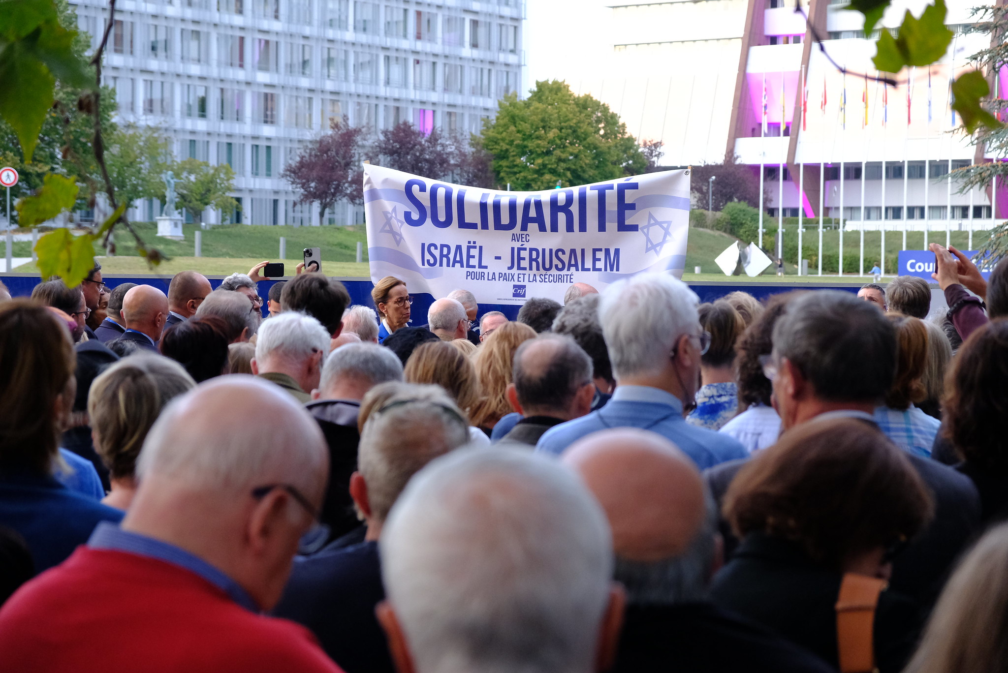 Devant une banderole « Solidarité avec Israël – Jérusalem », Pierre Haas, délégué régional du Conseil représentatif des institutions juives (Crif) a appelé l’Union européenne à considérer l’ensemble du Hamas comme une organisation terroriste et ses responsables comme des criminels de guerre.