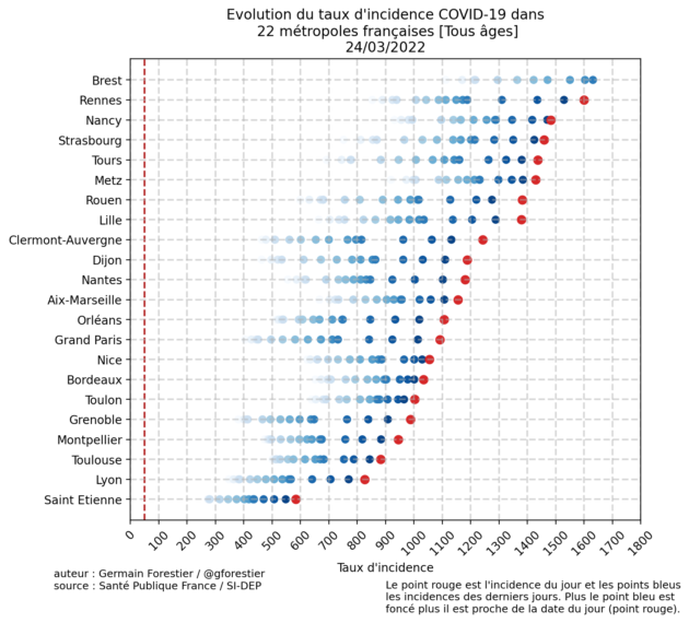 Selon un communiqué de presse de l’Agence régionale de Santé du 25 mars, le taux d’incidence dans le Grand Est a le plus augmenté parmi les adolescents de 10 à 19 ans (1 995 au 22 mars). Ce taux reste élevé dans toutes les tranches d’âge, il est de 1 464 en moyenne du 16 au 22 mars. Cette augmentation de l’incidence est observée dans toutes les métropoles de France mais l’Eurométropole de Strasbourg connaît la troisième plus forte augmentation.