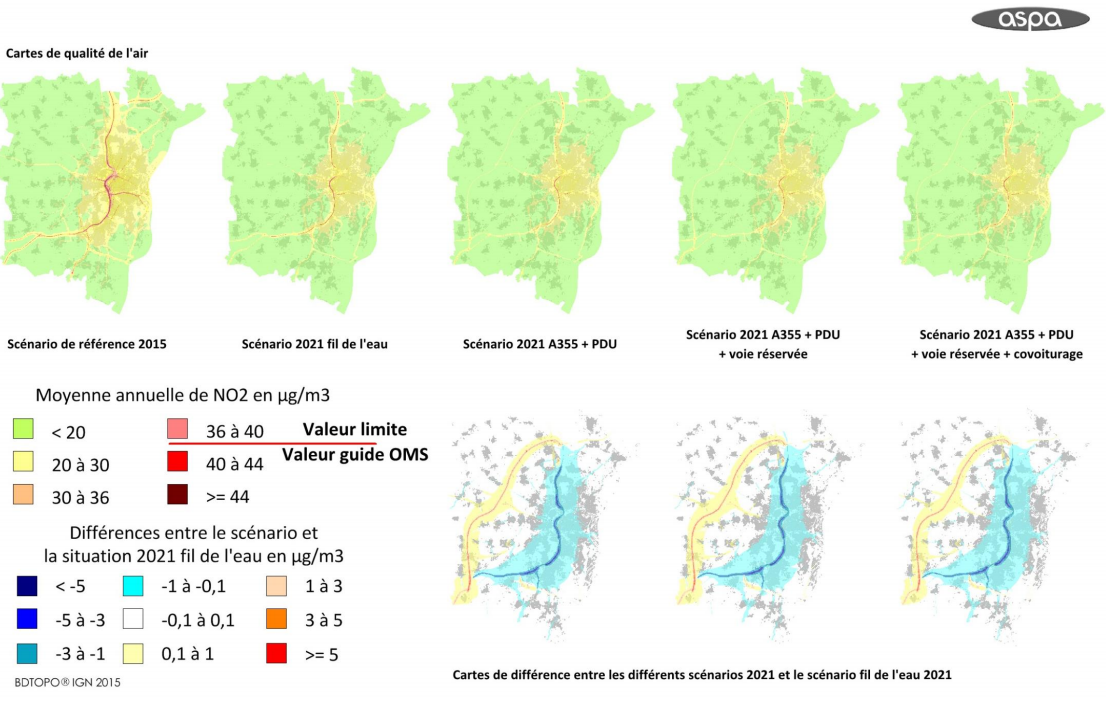Pour le NO2, les différents scénarios montrent une baisse de quelques microgrammes (souvent entre 1 et 5µg/m3), contrebalancée par des hausses à peu près équivalentes le long du GCO, mais sur un périmètre bien plus restreint.