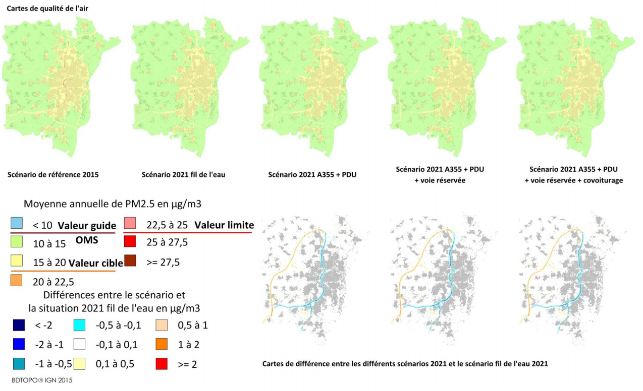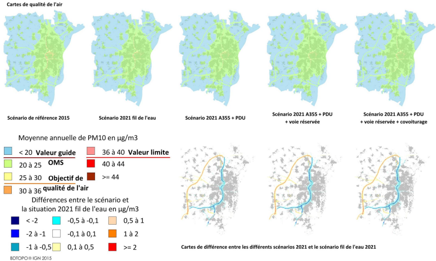 Pour les particules PM10, la différence est plus limitée, de l’ordre de 2 µg/m3 maximum. Le nombre de pics de pollution aux PM10 diminuerait de 5 à 3 jours par an par rapport à 2015. L’effet de l’infrastructure sur la qualité de l’air se déploie sur des surfaces plus petites.