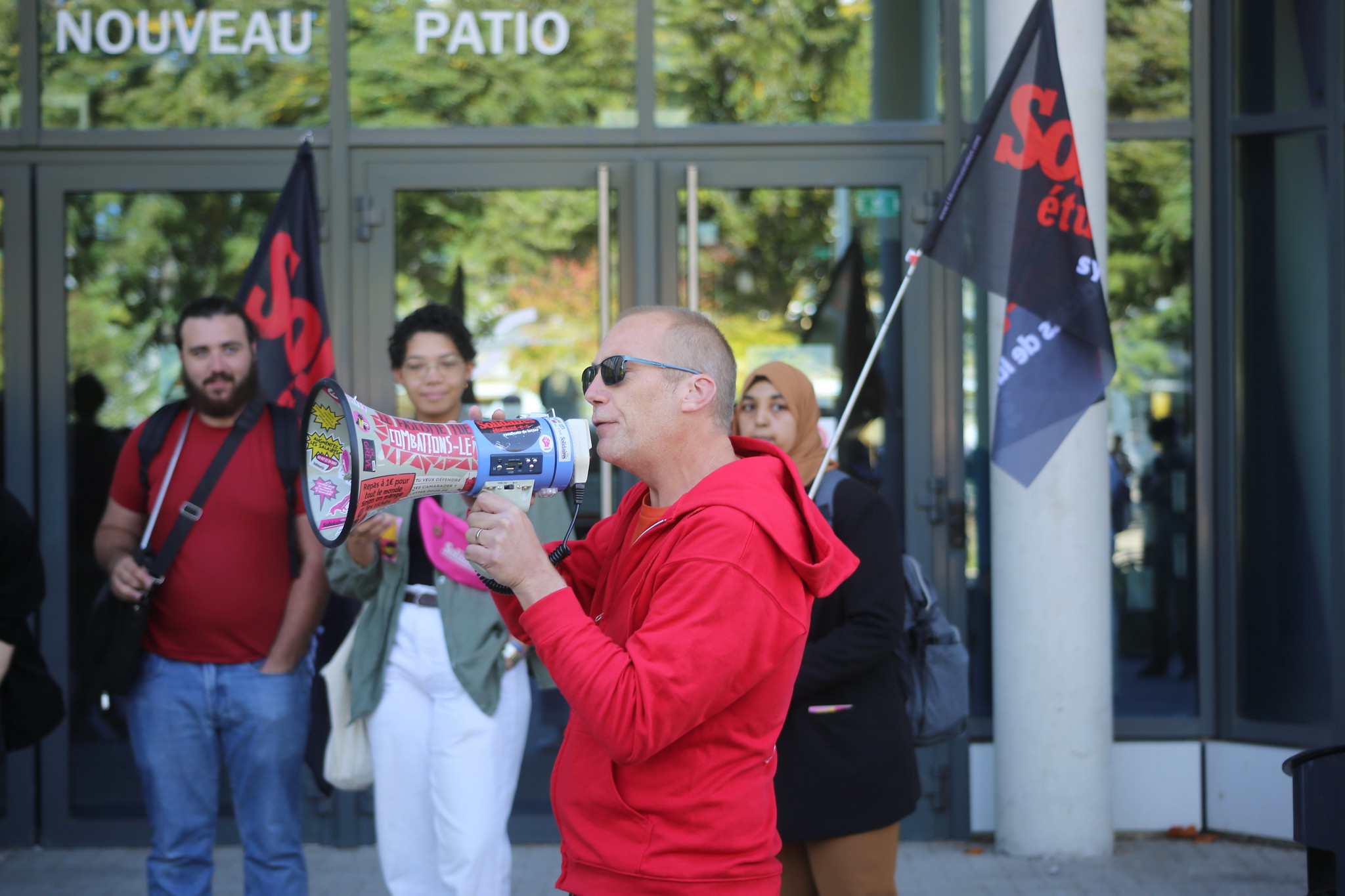 Devant le Nouveau Patio, une petite foule d’étudiants tenait un rassemblement bruyant, ce mardi 26 septembre. L’ambiance est chaleureuse, jusqu’à ce que le calme se fasse lors de la première prise de parole. Un des membres du syndicat Solidaires Étudiant-e-s donne le mot d’ordre : dénoncer la hausse des frais de scolarité pour les étudiants extra-européens et empêcher son passage en conseil d’administration, qui doit avoir lieu à 14h. « On va faire en sorte que cette mesure ne passe jamais à Strasbourg », poursuit un membre de l’Alternative étudiante Strasbourg (AES), mégaphone au poing.