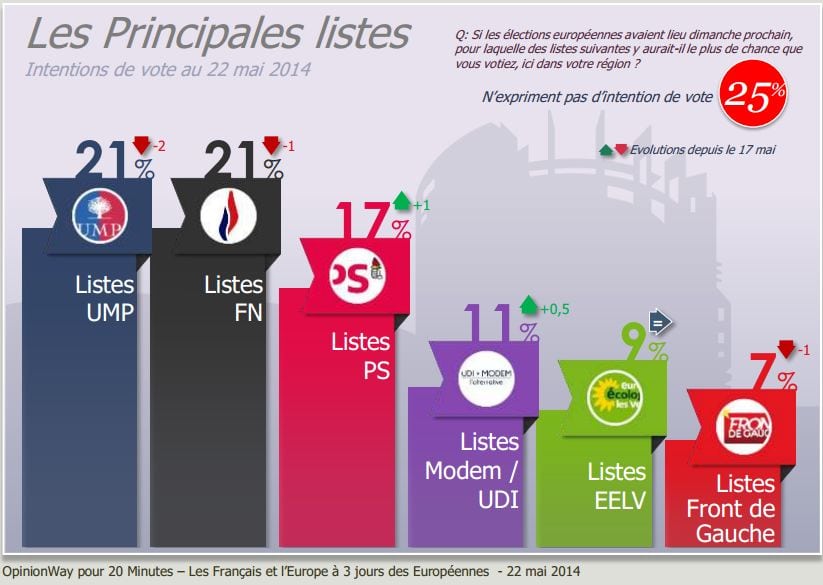 Un dernier sondage OpinionWay pour 20 Minutes publié le 22 mai prévoit 60% d’abstention en France et l’UMP et le FN à égalité à 21% des voix exprimées, tandis que le PS ne serait qu’à 17%, le Modem et l’UDI à 11%, les Verts à 9% et le Front de gauche à 7%.