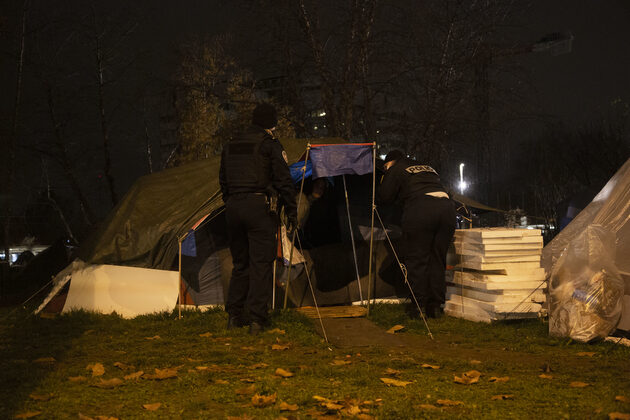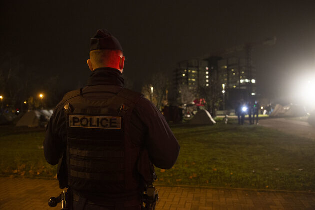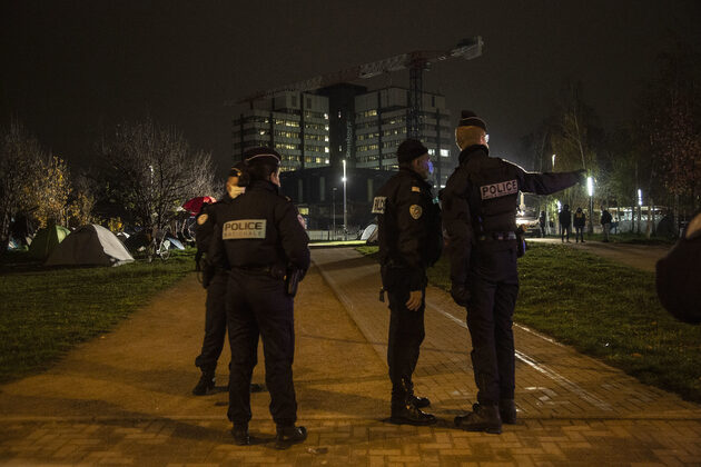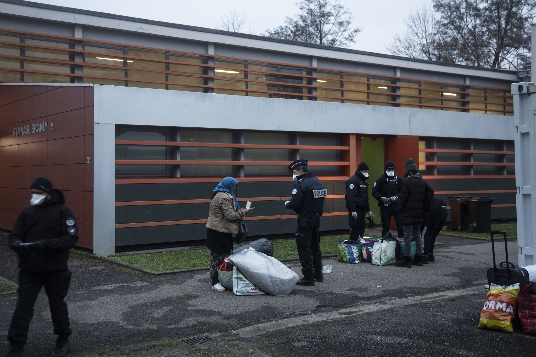 La nuit est encore noire mardi 6 décembre quand une quinzaine de fourgons de police et quelques véhicules légers se massent autour du campement érigé au pied du centre administratif de la Ville et de l’Eurométropole de Strasbourg. L’opération de démantèlement débute. Des agents de police réveillent les occupants de la place pour leur dire de préparer leurs affaires. Tout se déroule dans le calme.