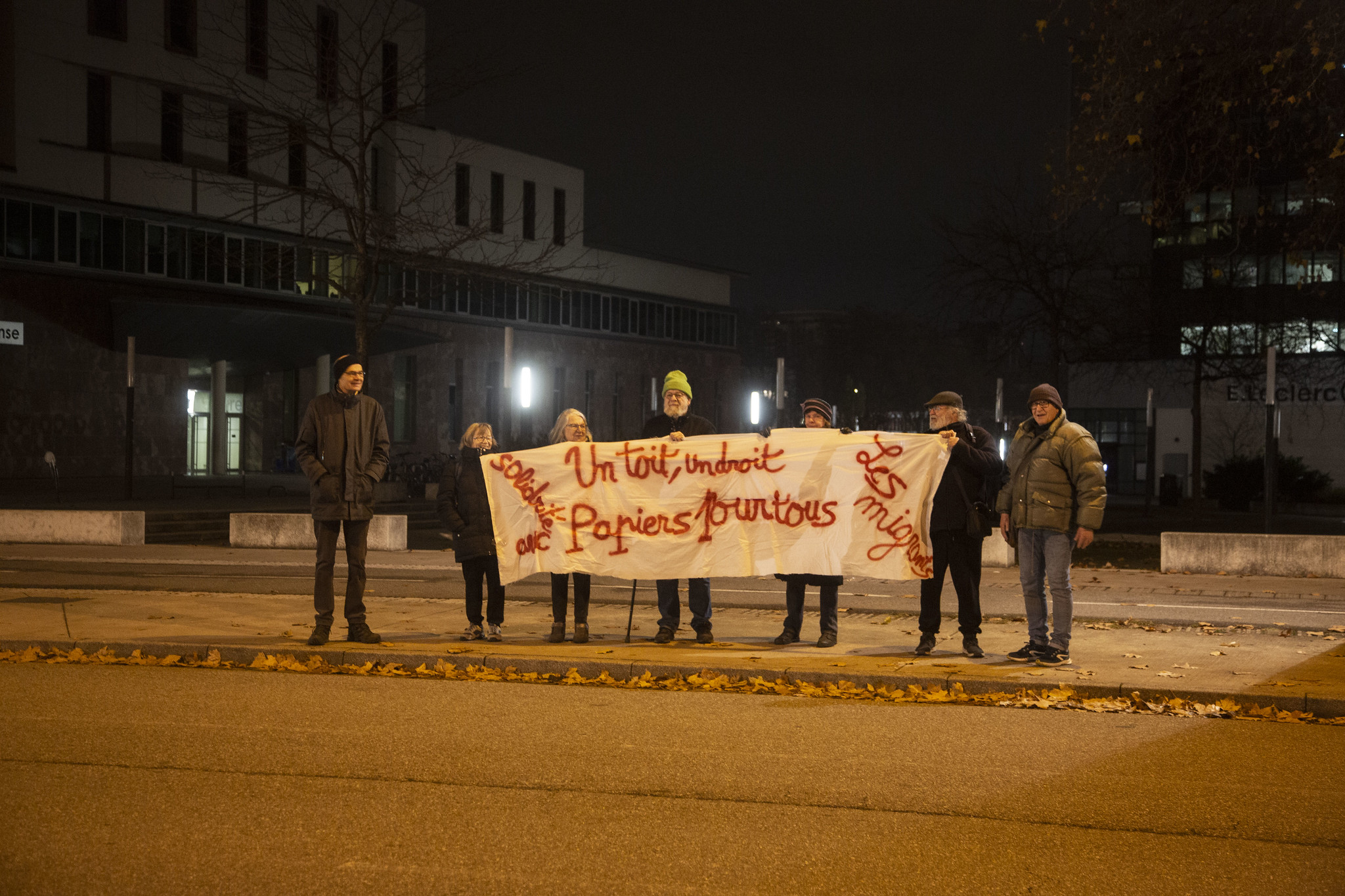 Dès le départ, une quinzaine de membres du collectif D’ailleurs nous sommes d’ici (DNSI) sont présents pour témoigner de leur « solidarité envers les migrants ». D’autres soutiens arrivent peu à peu, ils seront une cinquantaine en tout, derrière un périmètre délimité par de la rubalise, avec notamment cinq élus communistes et le député LFI Emmanuel Fernandes.