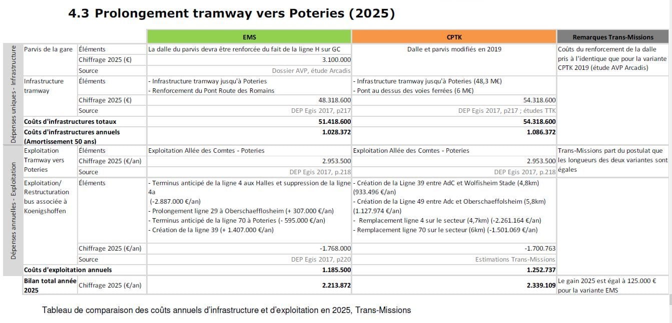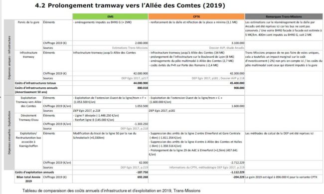 Certes, la variante du Collectif coûte un peu plus cher, notamment parce qu’il faudrait renforcer la place de la gare dès 2019 : 45,4 millions d’euros contre 42 millions. Mais ensuite, les coûts de fonctionnement seront moindres. Dans la variante de l’Eurométropole, ils engendrent 187 750 euros d’économies par an, par rapport à la situation actuelle, en raison de la fermeture de lignes de bus. Dans celle du Collectif, l’économie annuelle est de 1,112 million d’euros.