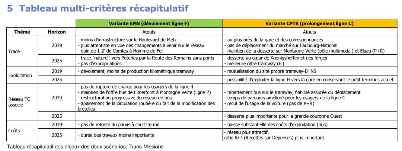 Quant au temps de trajet jusqu’à la place de l’homme de fer, ils estiment qu’il est de 9 minutes pour la variante de l’Eurométropole contre 10 minutes en cas de passage par la gare, sachant que la fréquence est meilleure sur la ligne C que sur la ligne F. Autrement dit, une différence négligeable.