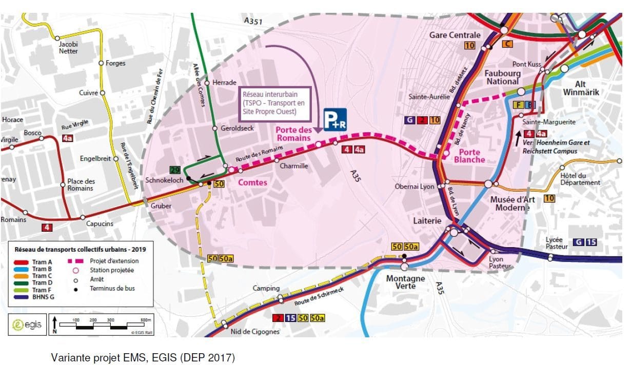 Ce projet, en plus de l’extension promise vers le parc des Poteries dans les deux variantes, est comparé à la construction d’une future ligne H. Cette ligne doit relier directement les institutions européennes à la Robertsau (qui va aussi connaitre une extension, dont les travaux débutent) à la gare, et donc en desservant les institutions européennes, sans correspondance.