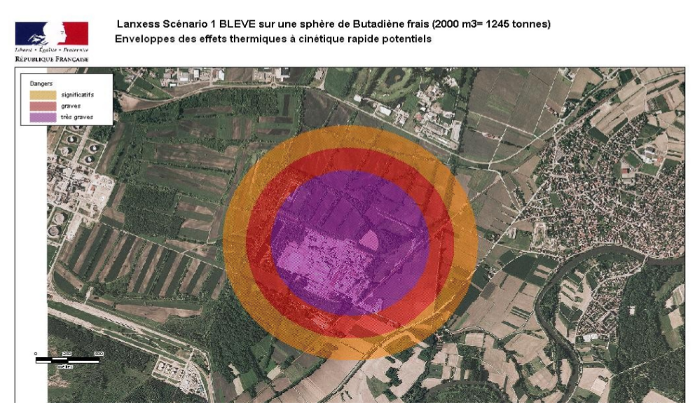 Ainsi l’explosion d’une sphère de butadiène frais provoquerait une mortalité de 5% au moins des personnes exposées jusqu’à 600 mètres du site, des blessures irréversibles seraient causées aux personnes situées à moins d’un kilomètre (voir schéma ci-dessus).