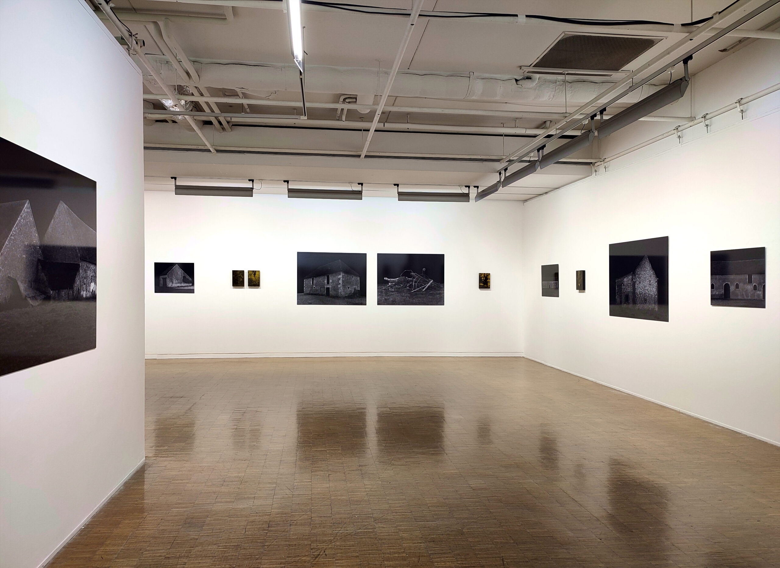 Autre série, autre ambiance. À l’inverse d’une intrusion du numérique dans l’argentique, les apparentes solarisations (perturbations de l’image lors du tirage qui bousculent les ombres et les blancs) des architectures rurales et éléments végétaux de Jour et Ombre sont uniquement le résultat du maniement d’un logiciel de retouche. L’obscurité présente dans le cadre rejoint celle qui entoure le décodage de cette série. Dans un style documentaire, semblable à un catalogue immobilier alternatif, on y comprend la mise en avant de ce qui est humble. Ce qui n’apparaît pas spectaculaire au premier abord, devient le centre de l’attention : des bâtisses de fermes, des tas de bois, etc. Formant par leur ciel noir des scènes presque oniriques (ou cauchemardesques selon le point de vue), ces images laissent une indépendance dans leur compréhension. Pure contemplation formelle ou œuvre manifeste en faveur de la légitimation esthétique de la ruralité, on hésite encore.
