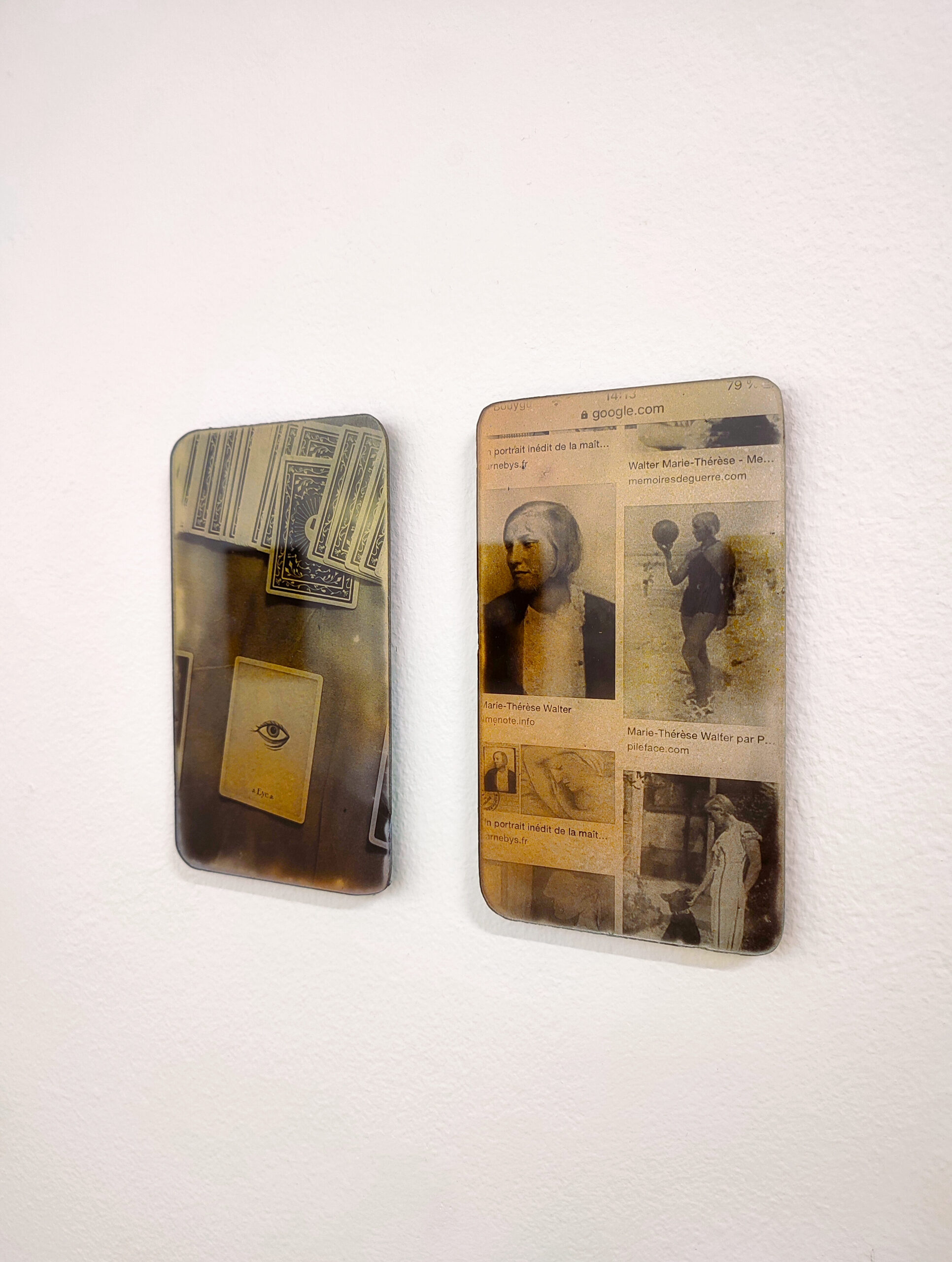 Dans la série Jour le Jour, des images extraites de la galerie du téléphone de l’artiste sont tirées sur des plaques de verre, découpées selon la forme d’écrans de smartphones. Bribes de vie, pages de livres, captures d’écrans, plusieurs natures d’images cohabitent. Habituellement hiérarchisées entre elles, classées selon leur valeur esthétique et l’intention qui les a portées, elles sont ici remises au même niveau, celui d’une annexe de la mémoire. Qui n’a jamais utilisé la caméra de son smartphone en tant que bloc-note visuel ? Sans jugement de valeur, l’artiste considère ces clichés comme des objets dignes d’intérêt.