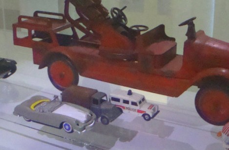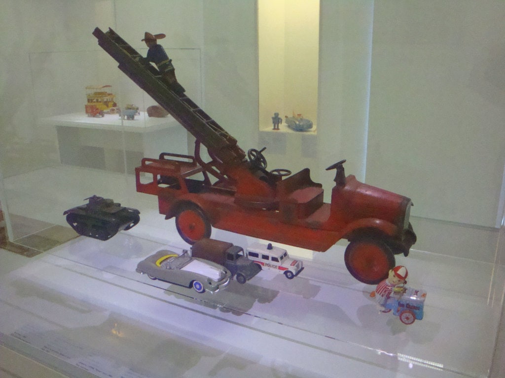 Une fois arrivé au musée, direction le premier étage. Sitôt entré, le visiteur est directement transporté dans une ambiance enfantine. Dans la vitrine centrale, un camion de pompiers, des voiturettes, un camion de livraison (voir photo ci-dessus) et un char d’assaut. Les fans de Tomi les auront reconnus. Faisant écho à l’oeuvre du dessinateur, ces jouets sont des répliques parfaites d’une scène de « Jean de la Lune« , conte pour enfants imaginé par le dessinateur en 1966, adapté au cinéma. Pour dessiner cet album, il a puisé dans son enfance et utilisé ses propres jouets, que le musée a décidé de reconstituer pour l’exposition.
