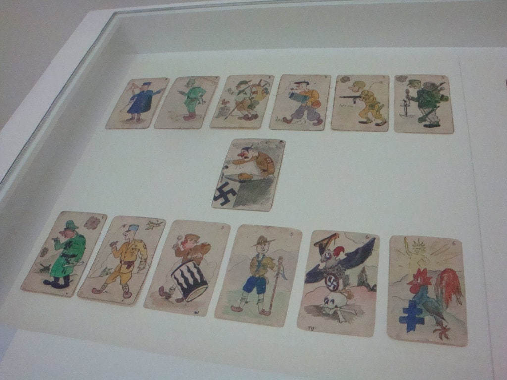 Il y a cependant plus de jeux de société que de jouets dans cette exposition. Dominos, jeux de hasards, puzzles, jeux de cartes, boîtes de cubes, jeux de l’oie… Tous les classiques y sont ! On retrouve évidemment des créations du dessinateur. Symbole de son engagement contre le fascisme et toute forme d’intolérance, on découvre son propre exemplaire du jeu de carte intitulé le « Schwarzpeter » où Hitler représente la mauvaise carte.