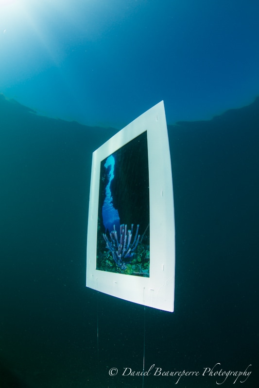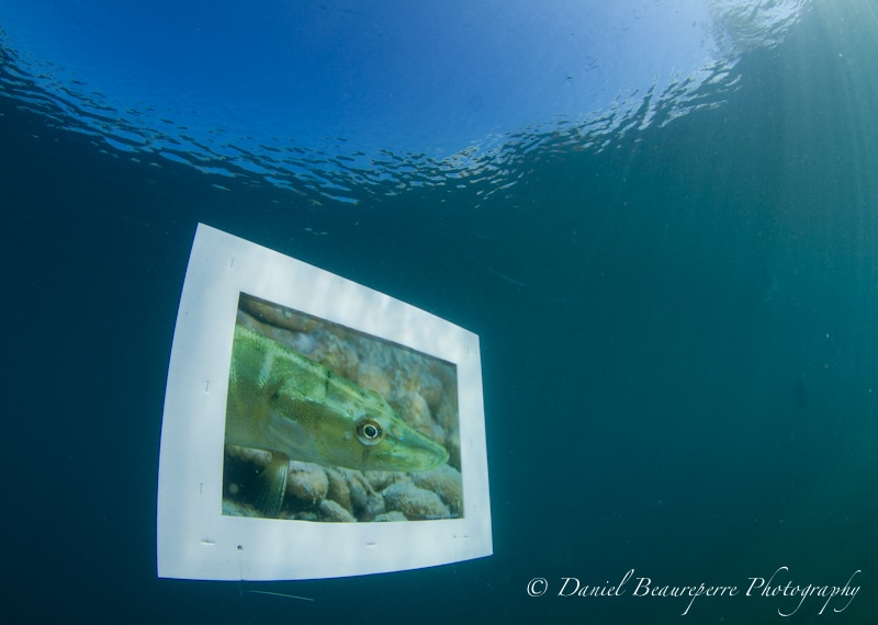 L’exposition était située entre deux pontons à partir desquels les plongeurs et futurs baptisés pouvaient se mettre à l’eau. Les images étaient lestées de plomb et se trouvaient à des profondeurs différentes. On pouvait passer de l’une à l’autre au milieu de la végétation, des poissons et, bien entendu, des plongeurs. En fait, c’était étrange mais positivement surprenant : il y avait le bonheur d’être dans l’eau, de pouvoir y respirer mais aussi de pénétrer dans un monde qui, bien que familier (ce n’était pas la première fois que j’y plongeais), était aussi une exploration d’un environnement en constante mutation évoluant au grès des saisons, qu’il est intéressant de voir et de revoir.