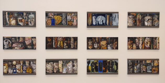 Les peintures de Stéphane Belzère, subjugué par l’aspect ondoyant du verre, du liquide et de la lumière, sont une ode à la matière vivante. Plus qu’un objet de conservation, le bocal devient une source d’inspiration déployée à l’infini. En regard des Mains des Anges, une succession de peintures figure des étagères sur lesquelles sont posés des bocaux. À la manière d’un inventaire, le peintre recense un à un les spécimens conservés dans les réserves muséum national d’Histoire naturelle de Paris.