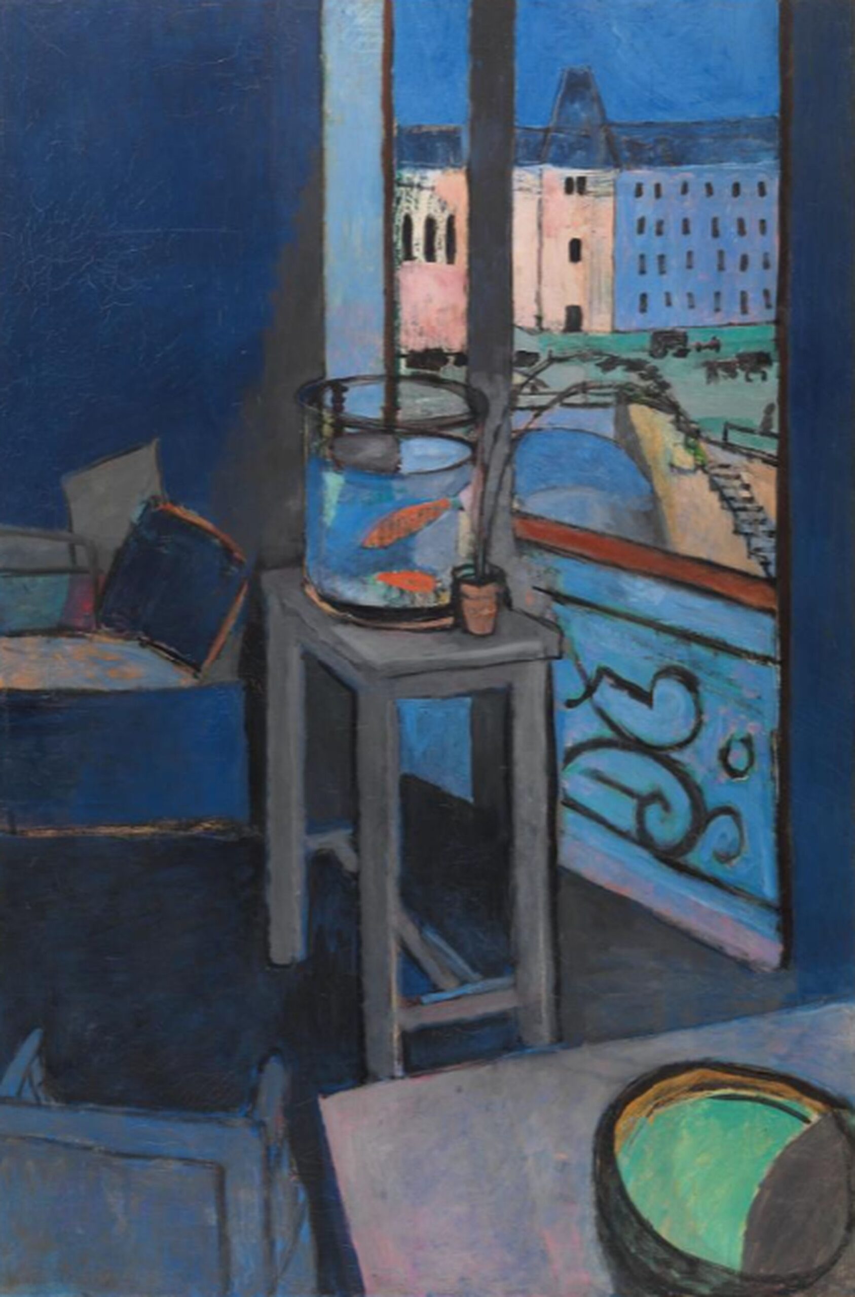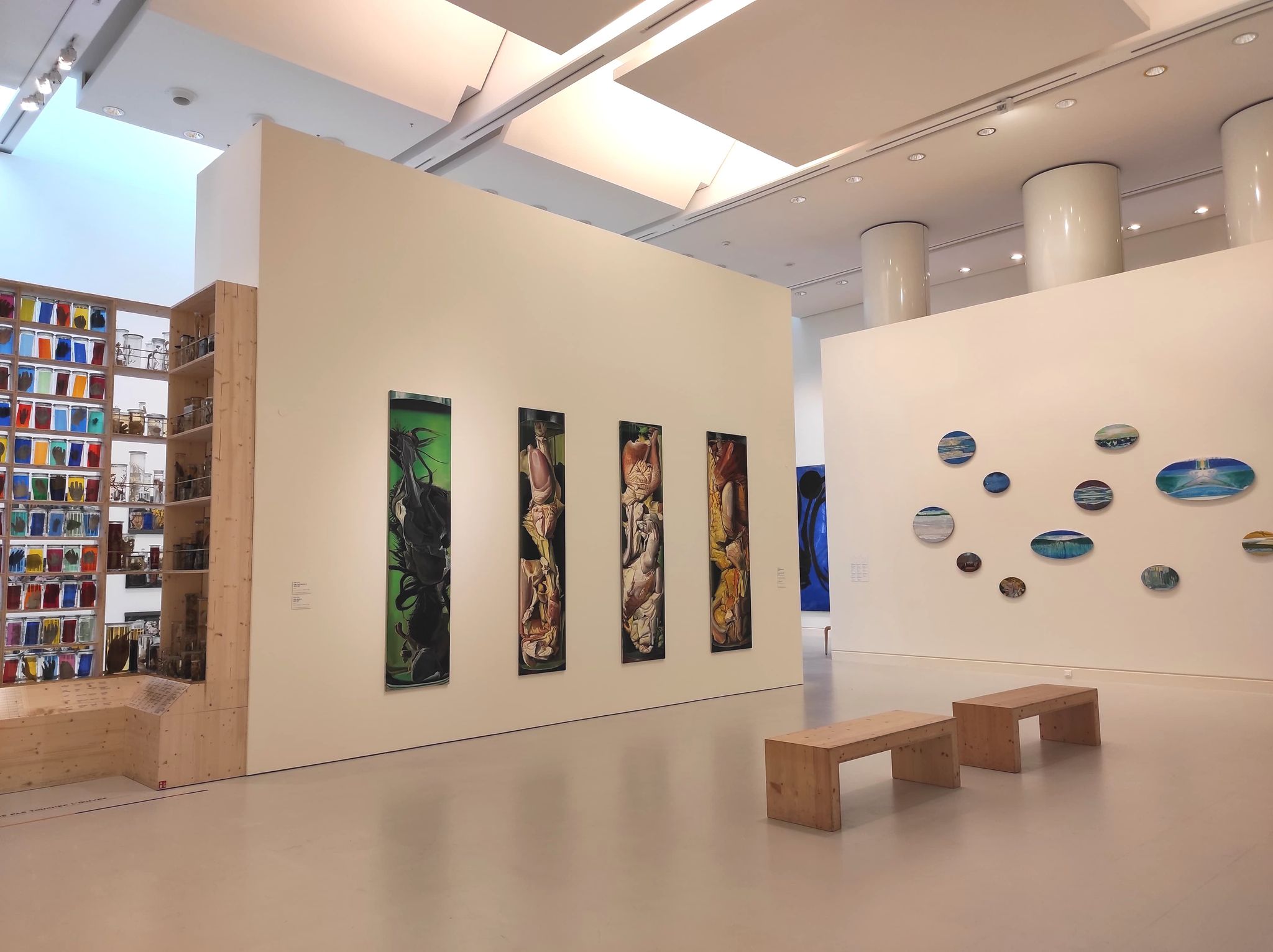 Au détour d’un couloir, accrochées l’une face à l’autre, les Immersions. Deux tableaux monumentaux qui apportent un point de vue original : d’observateur à modèle, le visiteur est plongé dans le liquide de conservation d’un bocal. Dans ce milieu aquatique, des courbes révèlent un monde déformé. En écho à La Salle des pièces molles-nocturne, une fenêtre est visible en arrière-plan. Imprégnées de bleu, ces œuvres rappellent l’Intérieur, bocal de poissons rouges de Henri Matisse, d’où émerge une tension entre intérieur et extérieur à travers la fenêtre d’une chambre. Un regret cependant : la distance entre les peintures ne permet pas une totale immersion dans cet univers outremer.