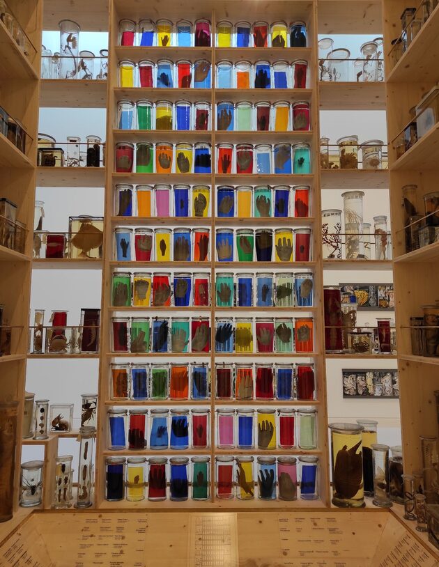 Issus des collections du musée zoologique de Strasbourg, plus de 200 spécimens conservés en fluide sont rangés sur des étagères spécialement conçues par l’artiste pour l’exposition. Au centre, prend place une œuvre déconcertante de Stéphane Belzère, Les Mains des Anges. Cette installation, la seule parmi les peintures exposées, donne à voir des bocaux dans lesquels flottent étrangement des mains en moulage de cire réalisés par l’artiste et des plaques de verre colorées. La rencontre singulière entre les collections du musée zoologique et l’installation de Belzère génère une résonance entre passé et présent.
