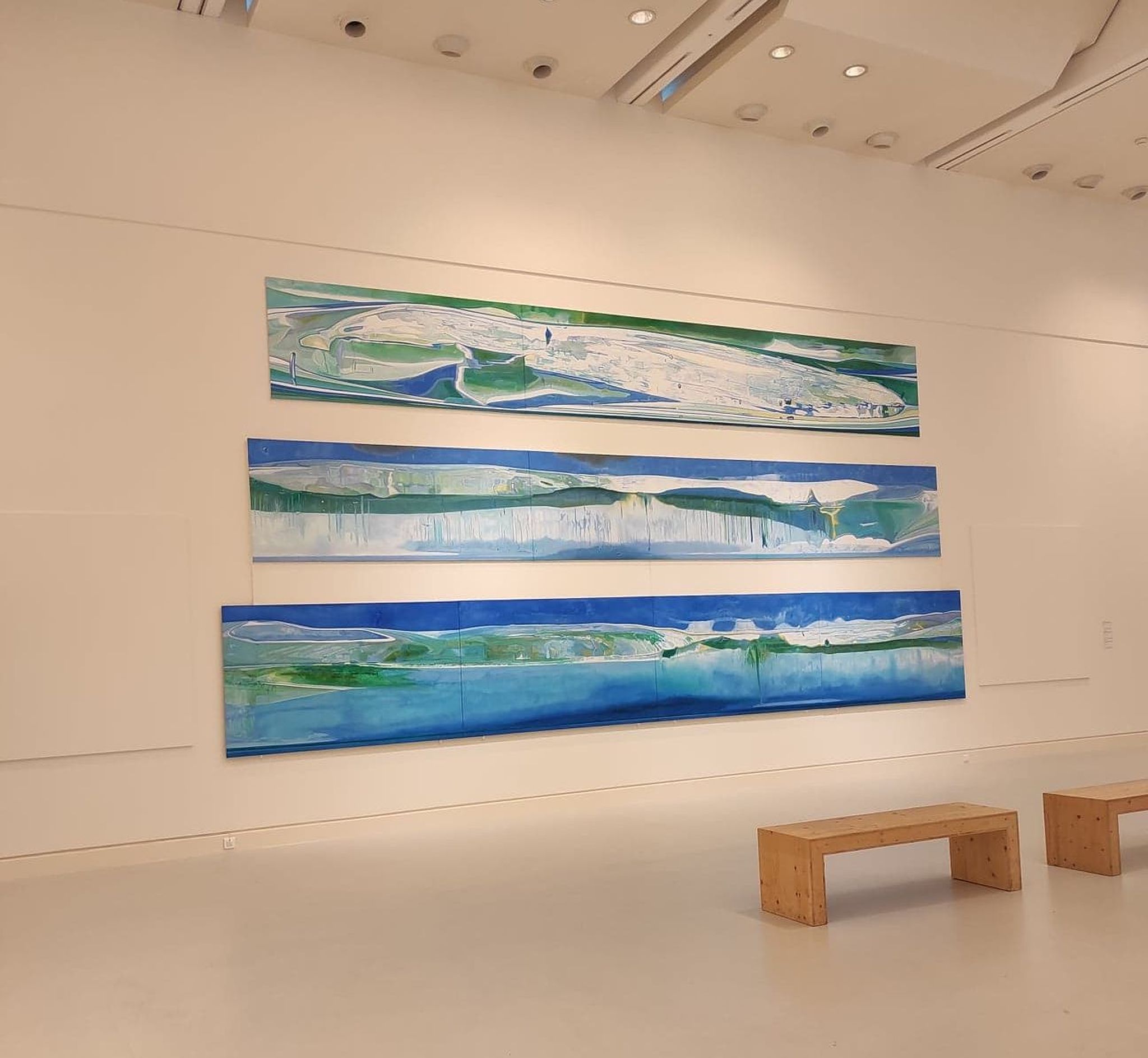 Les nuances de bleu, de vert et de blanc contrastent avec les dominantes de gris, de vert et de marron des œuvres précédentes. L’émergence de la clarté est la bienvenue après l’accumulation de formes étranges et sombres. Un retour au calme, un moment de parenthèse presque méditatif.