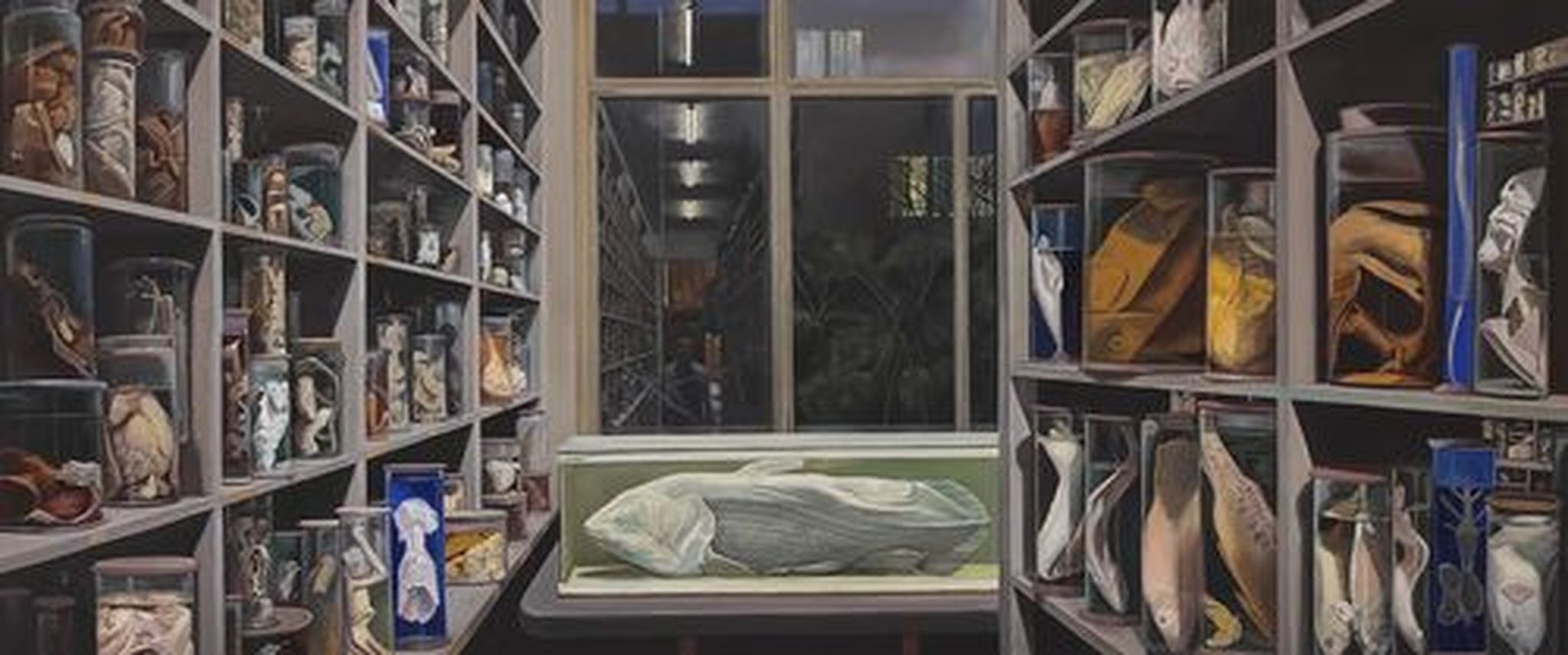 L’artiste dépeint ici les réserves du muséum national d’Histoire naturelle de Paris où il installe son chevalet au milieu des années 1990. Entre ces murs, une véritable passion naît chez l’artiste, malgré l’atmosphère inquiétante qui inonde l’espace et la répulsion que produisent ces objets. Une fascination qui, rapidement, se transforme en obsession, jusqu’à devenir le sujet principal de ses peintures.