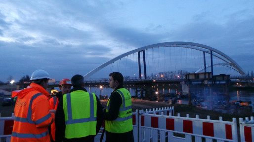 « Le pont sur le Rhin est plus important par sa taille. Il a été monté entièrement sur la berge et a ensuite été mis en place par-dessus le fleuve. Il repose sur une pile centrale et tous les câbles, qui servent d’appuis, ont été tendus avant le déplacement du tablier. Ceci explique pourquoi nous avons dû fermer la navigation du côté allemand du Rhin ».