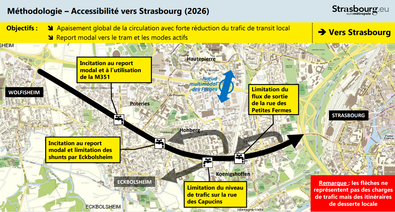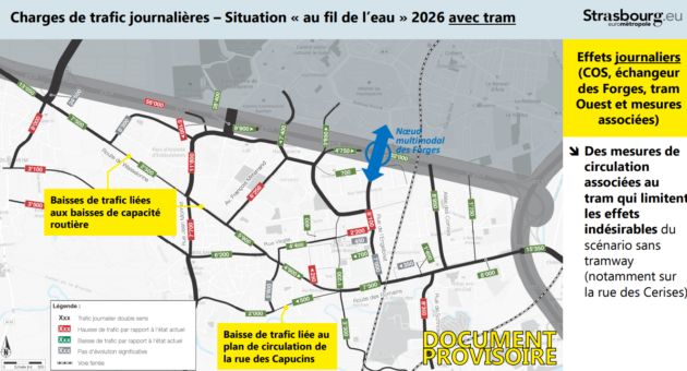 Selon les documents présentés, le trafic baisserait de 50% sur le tronçon Térence-Capucins et de 55% sur le tronçon Petites fermes – Schnokeloch. Sur le passage à sens unique de la route des Romains, la Ville envisage une charge de 4 900 voitures (au lieu de 9 770 à ce jour), et sur le tronçon suivant, maintenu à double sens, 7 300 véhicules par jour (au lieu de 11 000 à ce jour).