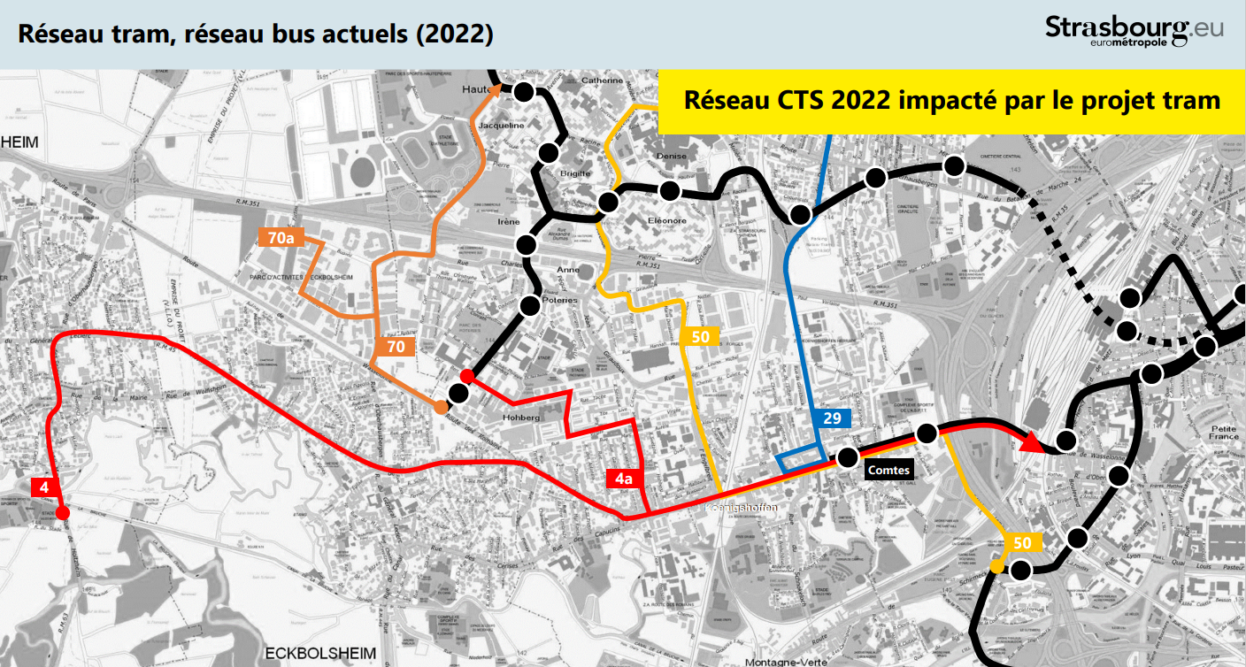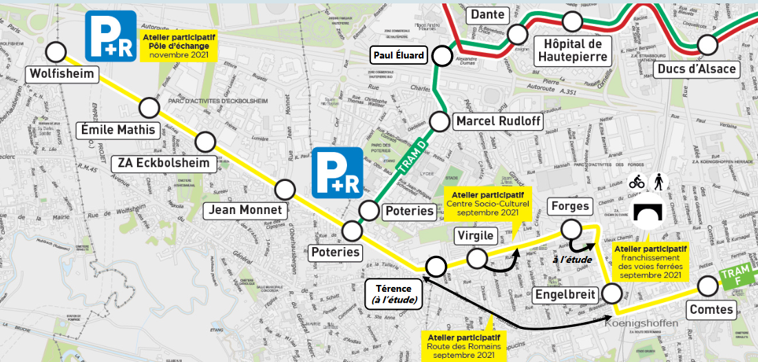 Qu’est-ce qui provoque tant d’exaspération ? En 2025, la ligne F du tram doit être prolongée au-delà de l’arrêt Comtes pour passer par le quartier du Hohberg, le quartier des Poteries, atteindre Eckbolsheim et se terminer à Wolfisheim, à l’entrée de la commune, au niveau du rond-point et non loin du Super U. Ce sont un peu moins de quatre kilomètres de ligne et huit stations supplémentaires pour un coût estimé à 80 millions d’euros.