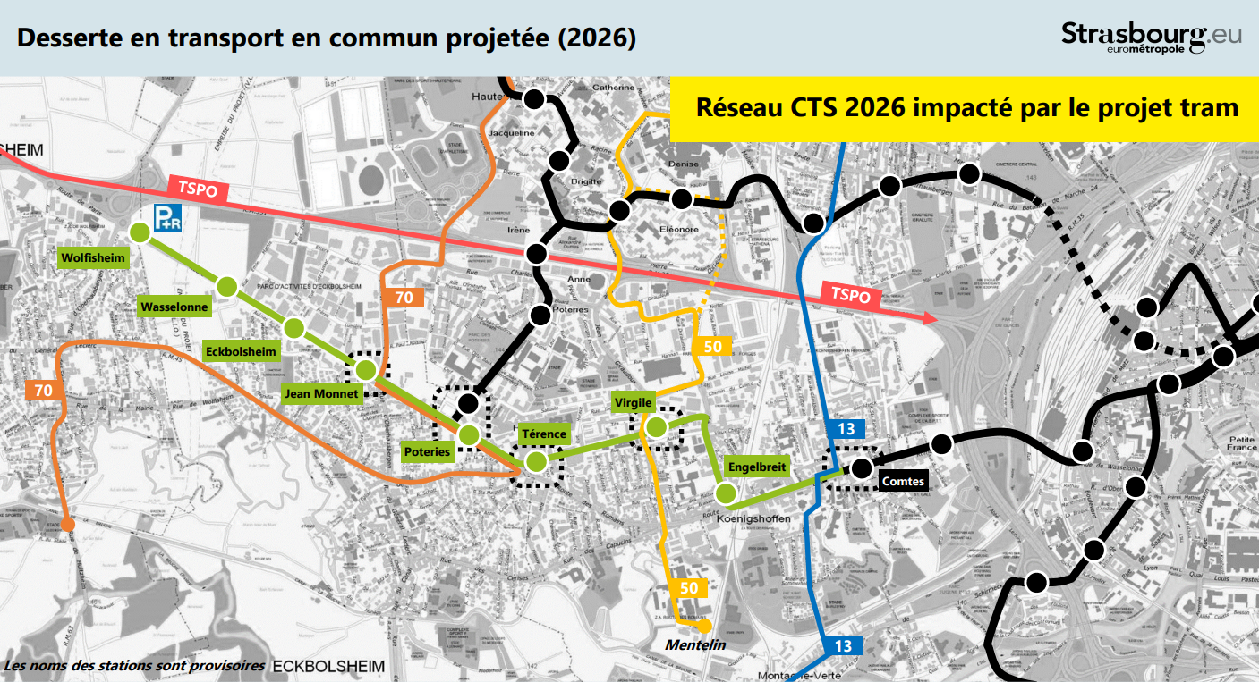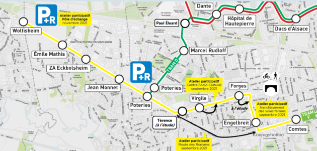 Puis le tracé a été modifié après des réunions de concertation qui ont eu lieu à l’automne 2021 et au printemps 2022. Objectif : faire baisser le trafic sur la route des Romains et inciter les habitants de l’ouest de Strasbourg à laisser leur voiture pour venir à la gare et au centre-ville en tram. Le projet inclut aussi divers aménagements pour sécuriser les trajets cyclistes et piétons, et prévoit de rénover certains espaces.