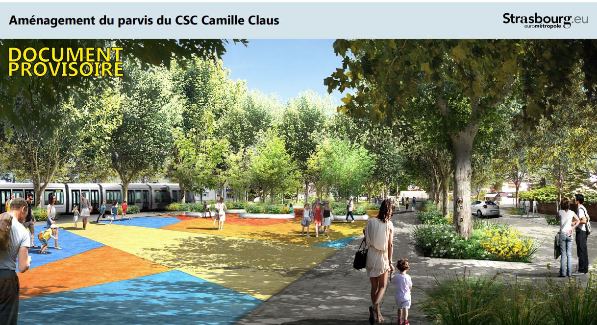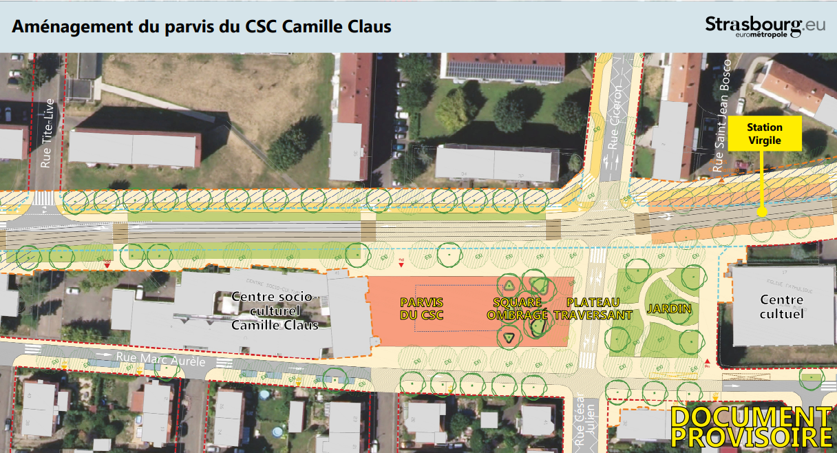 L’objectif présenté : créer des espaces « parvis ouvert », « square » et « jardin », favoriser la circulation des piétons entre les rues Marc Aurèle et Virgile et entre le parvis du CSC et celui de l’église St-Jean-Bosco (transformé en jardin), créer une voie mixte rue Virgile pour cyclistes, piétons et voiture, avec priorité des piétons sur les voitures.