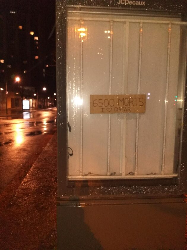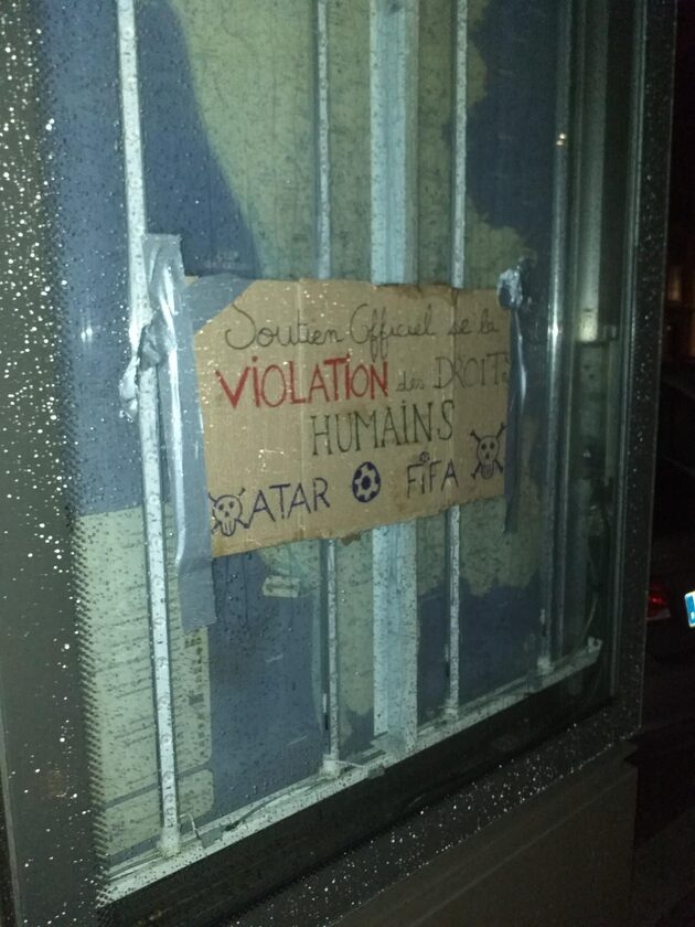 Lors du week-end du 22 octobre, Extinction rébellion Strasbourg a remplacé certaines annonces par des panneaux sur la coupe du monde de foot au Qatar, « afin de sensibiliser le public aux dégâts environnementaux et sociaux qu’a provoqué l’organisation de cet événement ».