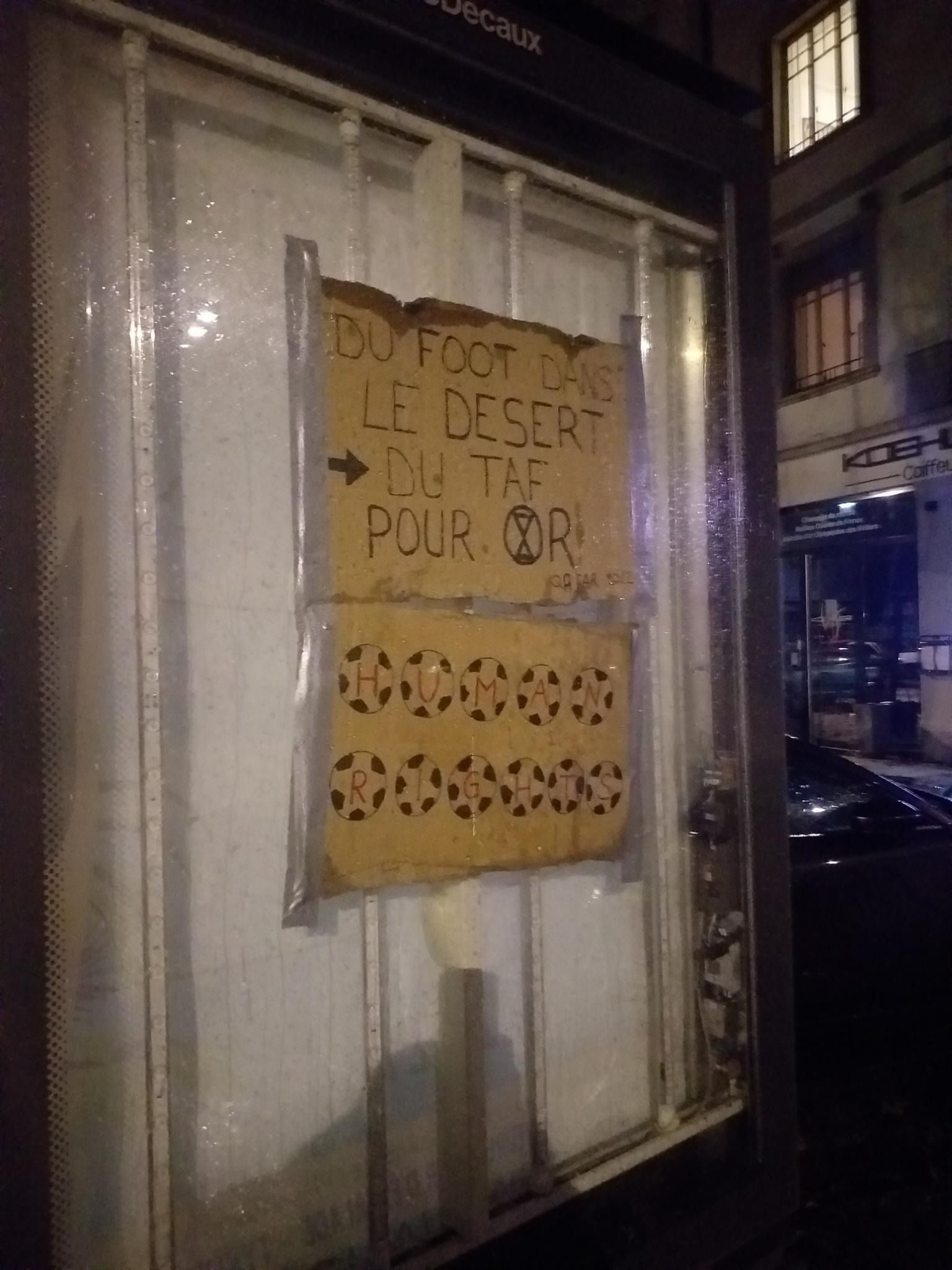 Lors du week-end du 22 octobre, Extinction rébellion Strasbourg a remplacé certaines annonces par des panneaux sur la coupe du monde de foot au Qatar, « afin de sensibiliser le public aux dégâts environnementaux et sociaux qu’a provoqué l’organisation de cet événement ».