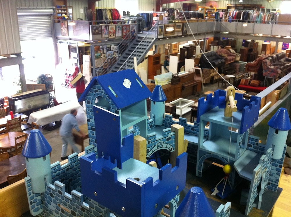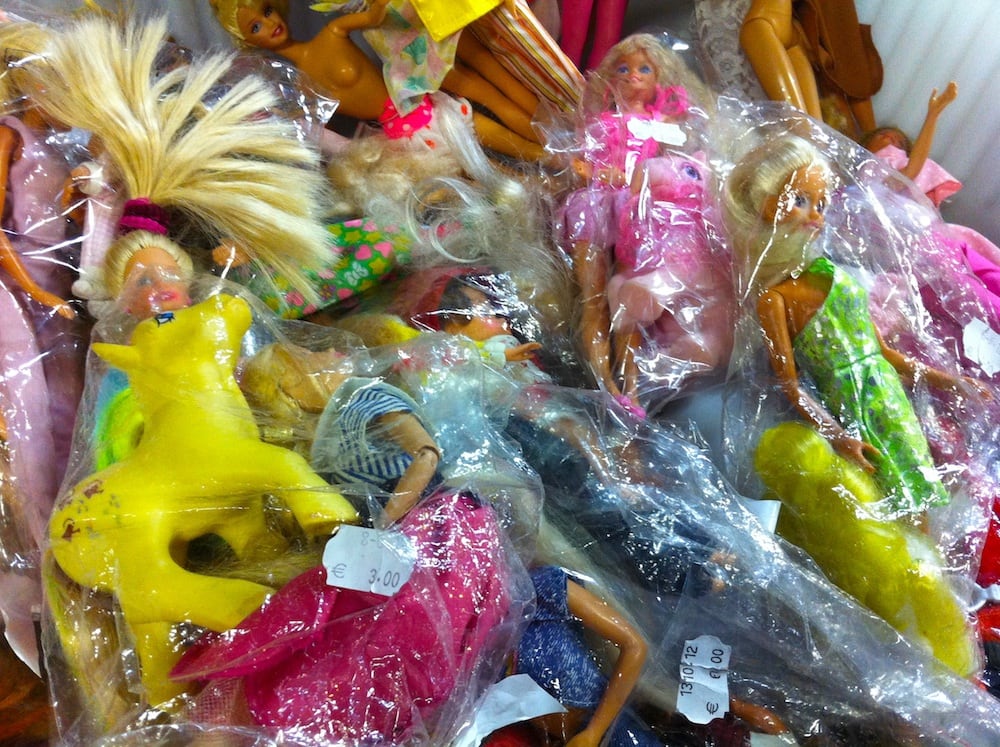 Au rayon jouets, sur la mezzanine de l’entrepôt d’Emmaüs Mundolsheim, au nord de l’agglomération de Strasbourg, il reste encore quelques jolies pièces. Un château en bois à 10€, des chevaux Barbie à quelques euros (cheveux emmêlés certes), des poupées pour filles et garçons nues ou habillées à 2,50€, des lots reconstitués et augmentés de Playmobil à 8 ou 10€, des puzzle pour bébé – complets – à 1,50€…