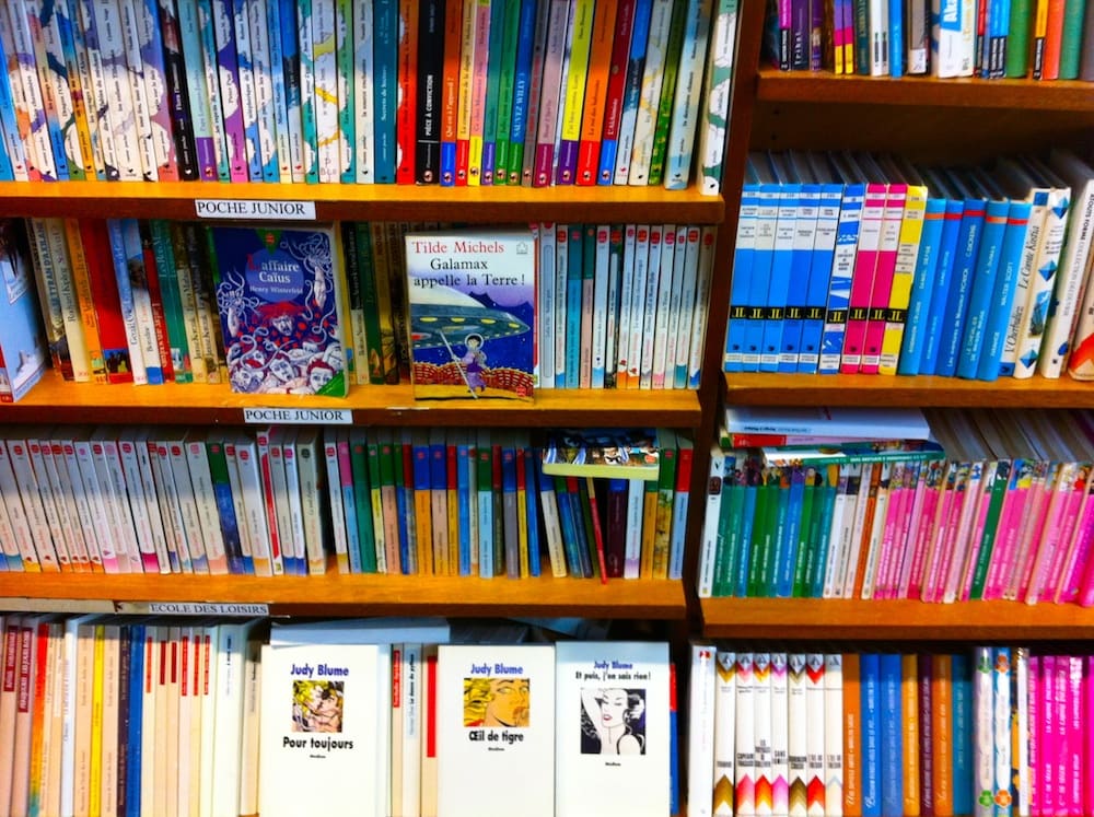 Juste à côté, des livres pour enfants sont rangés serrés sur des étagères bondées : 0,50€ le poche, 1€ la bande dessinée qui fait fureur en 2015, 2€ le livre de contes cartonné, jusqu’à 10€ les beaux livres pour adultes. On y trouve des éditions récentes ou plus anciennes. Attention nostalgie : bibliothèques verte et rose, petits cartonnés rouge et or, il y en a pour toutes les générations. Avec en prime, sur la deuxième de couverture, des « Ce livre appartient à Patricia » ou « À Béatrice de la part de mamie »…