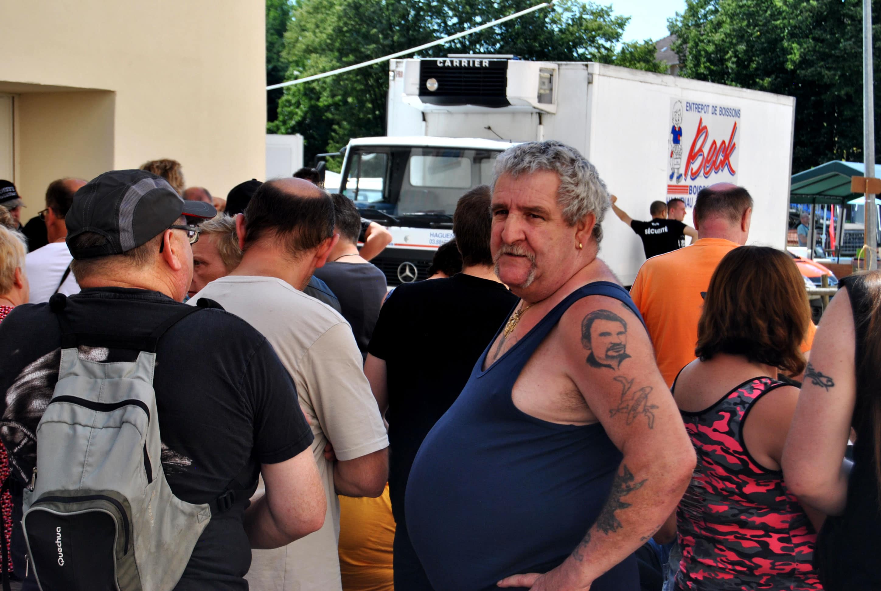 Marco, lui, n’est pas tatoué à l’effigie de Johnny. Originaire d’un village près de Strasbourg, il n’a pas de voiture fantasque ou de Harley. Devant la buvette, accompagné de quelques amis, il montre son antiquité favorite, un tee-shirt :